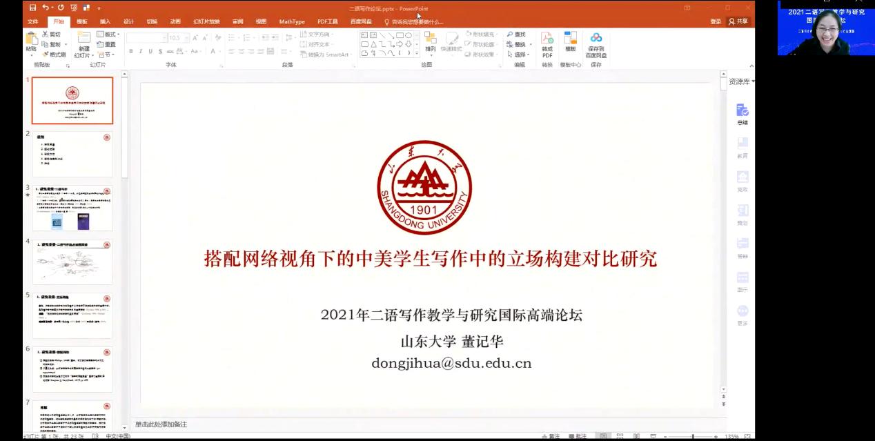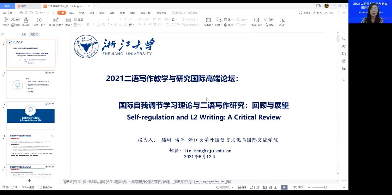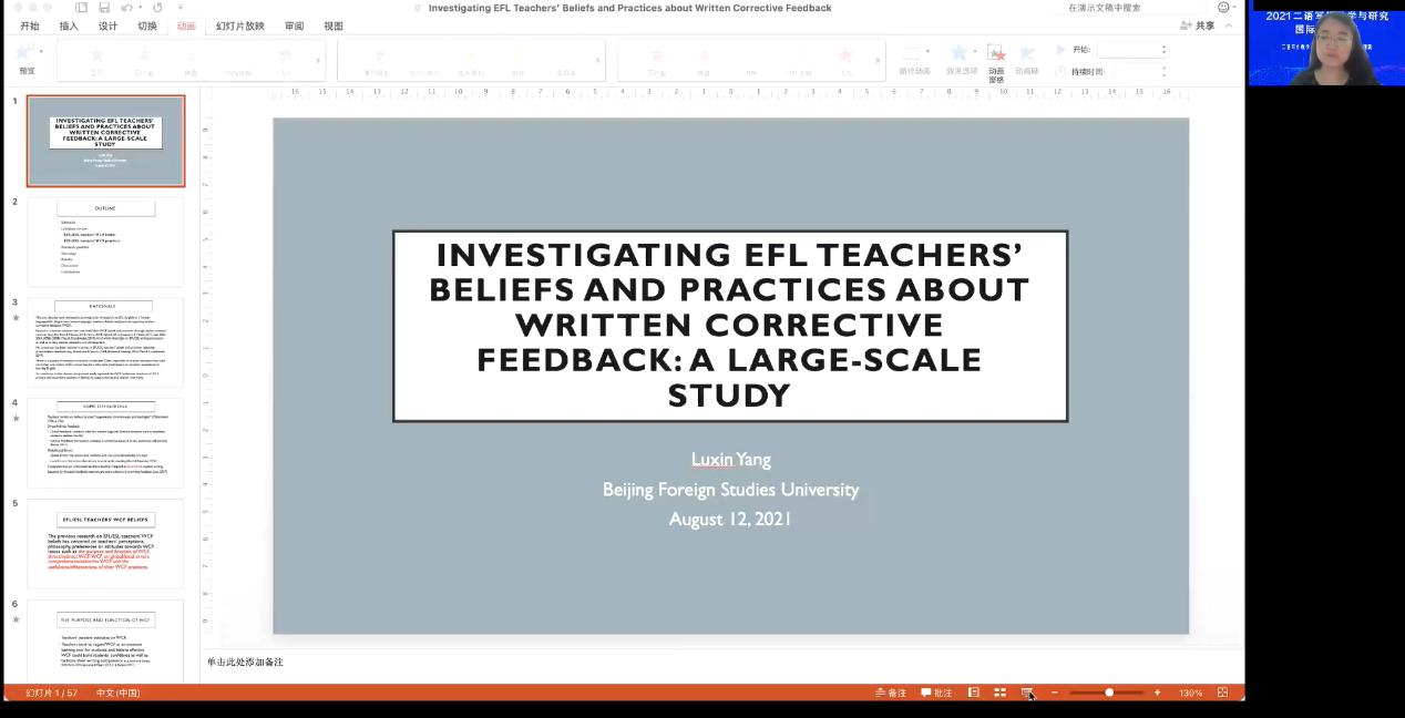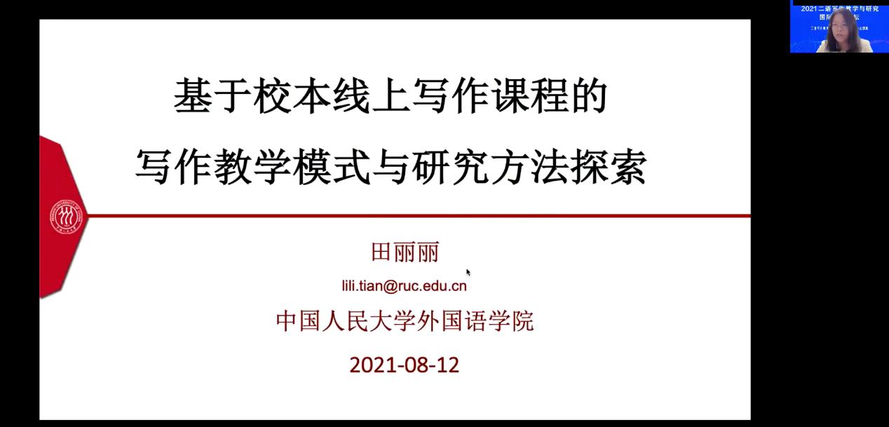 中国人民大学田丽丽教授基于中国人民大学校内运行的大学英语写作线上课程,聚焦写作教学中的实际问题,分享了以线上课程为主的英语写作混合式教学模式探索,以及在技术支撑的二语写作教学模式下围绕学习者的投入和策略使用开展的两项研究。