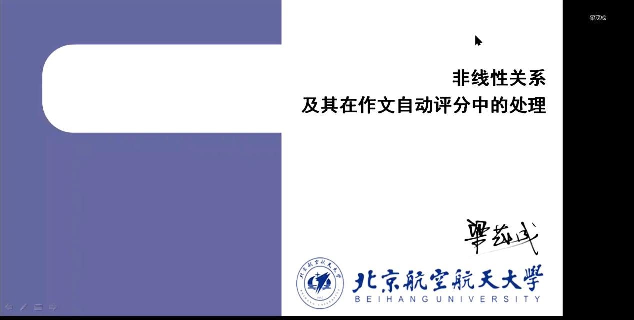 北京航空航天大学梁茂成教授的报告聚焦线性关系及线性回归与作文自动评分、非线性关系、非线性关系对自动评分模型的影响和非线性关系的处理方法等四个方面,提出要利用深度学习解决学生英语作文自动评分中的非线性问题,并预测了深度学习在二语写作研究中的发展前景。