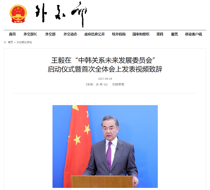 会议上,中国国务委员兼外长王毅发表视频贺辞,热烈祝贺“中韩关系未来发展委员会”正式启动。王毅说,建交29年来,中韩关系全面快速发展。近年来,在习近平主席和文在寅总统战略引领下,两国各领域交流合作进一步蓬勃发展。面对新冠肺炎疫情,中韩守望相助、风雨同舟,实现抗疫合作与友好关系齐头并进。王毅表示,当前国际地区形势复杂深刻变化,进一步加强中韩友好合作顺应时势、合乎民心,符合双方根本利益。中韩关系未来发展委员会的成立适应时代要求。