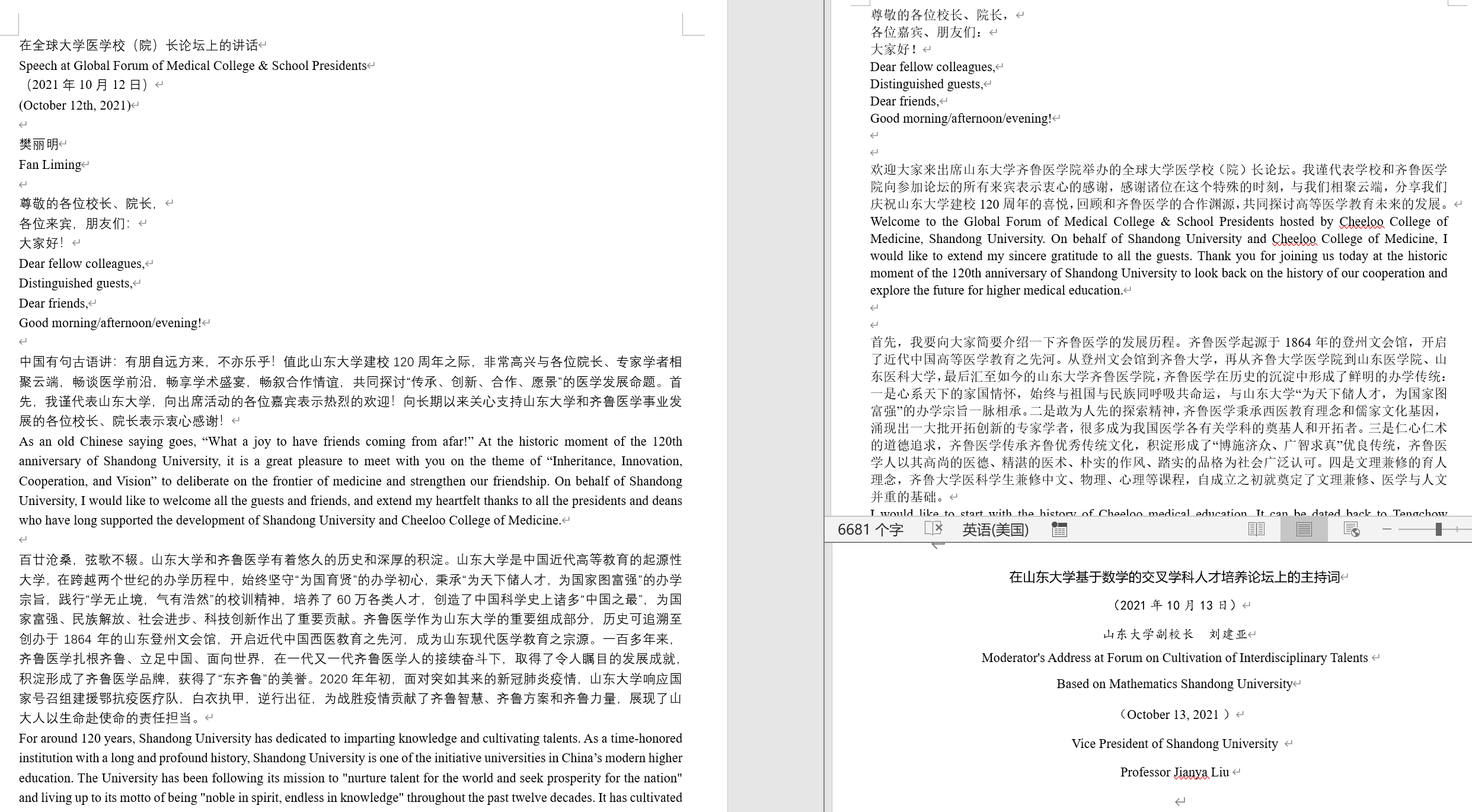 十月,校庆筹备进入冲刺阶段,团队迎来新挑战。作为全球大学校长论坛的系列活动之一,全球大学医学校(院)长论坛邀请了10余所全球顶尖医学高校校(院)长参与,我校樊丽明校长、易凡副校长均有重要发言,讲稿亟需翻译。与此同时,刘建亚副校长在“基于数学的交叉学科人才培养论坛”上的主持词翻译任务接踵而至。时间紧迫,团队迅速行动,分组翻译,反复审校,经两位老师审核,最终顺利交付万字译稿。