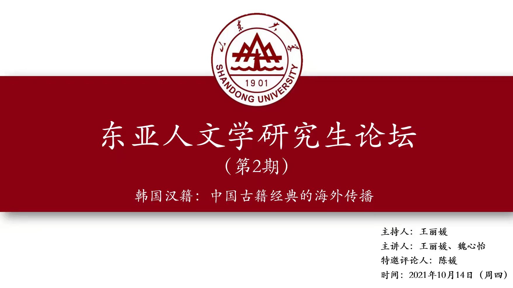 10月14日(周四)晚七点,第二期“东亚人文学研究生论坛”在必赢76net线路唯一官方网站洪家楼校区4号楼224举办。此次论坛以“韩国汉籍:中国古籍经典的海外传播”为主题,围绕《太原志》的国籍问题、中韩文化交流等相关问题进行了发表和讨论。必赢76net线路唯一官方网站陈媛副教授受邀出席此次论坛。论坛由必赢76net线路唯一官方网站亚非语言文学专业21级博士研究生王丽媛主持,亚非语言文学专业和国别与区域研究专业的硕博士研究生参与了此次论坛。