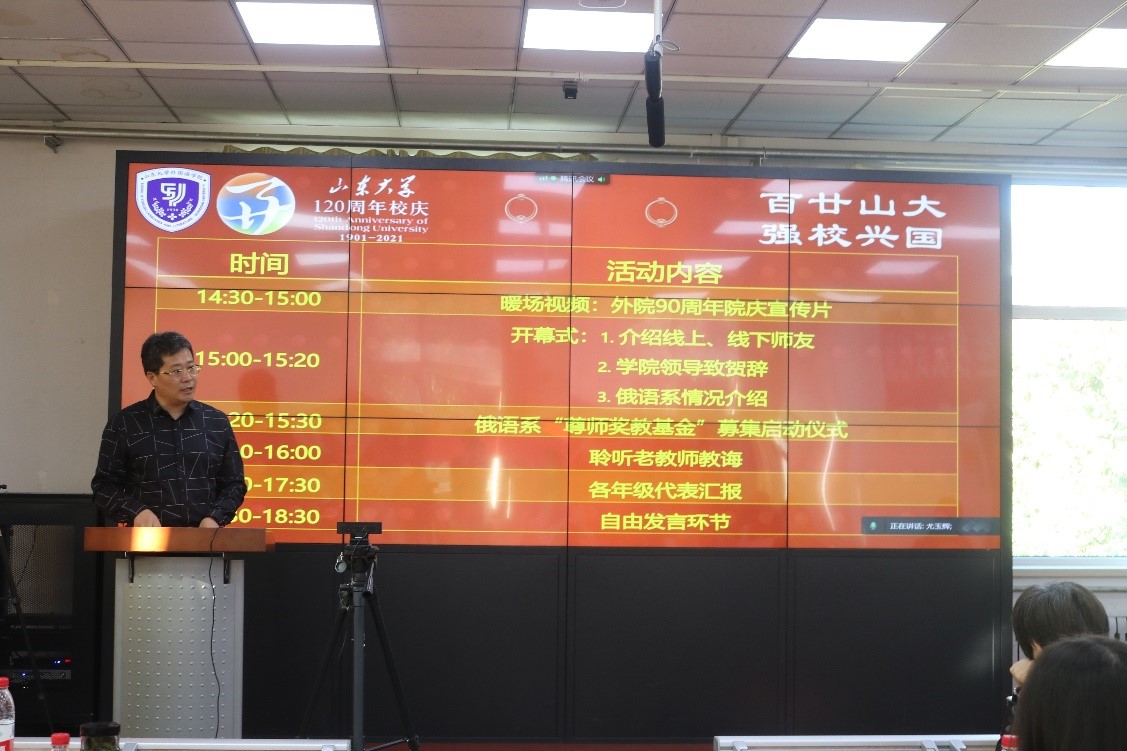 首先,李建刚副院长介绍了出席本次活动的师生代表并对他们表示热烈的欢迎和衷心的感谢。随后,薛佩军副书记发表致辞,他对俄语系教师、校友们表示热烈欢迎后,详细介绍了学院的历史及近年来发展和取得的成绩,希望广大俄语系校友继续为学院发展建言献策、贡献力量。紧接着,俄语系皮野老师对俄语系历史、发展进程及未来发展方向作了详细介绍。他表示,山大外院俄语系从1950年设专业,经历了70多年的发展,山大俄语人的队伍在不断壮大,山大俄语人也在不断创造辉煌。