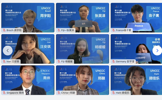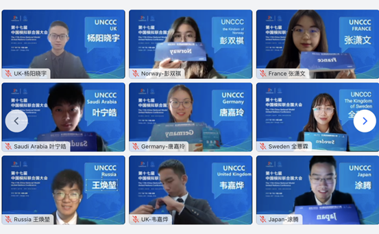 本次中国模拟联合国大会使用“飞书”软件在线上举行,共设5个分会场。6名同学分属两个会场:张潇文和曲子寰作为法国代表、顾佳乐作为海地代表属于联合国气候大会会场;孙一昊和殷晨浠作为俄罗斯代表、孔勐勍作为沙特阿拉伯代表参与联合国开发计划署会场的讨论。
