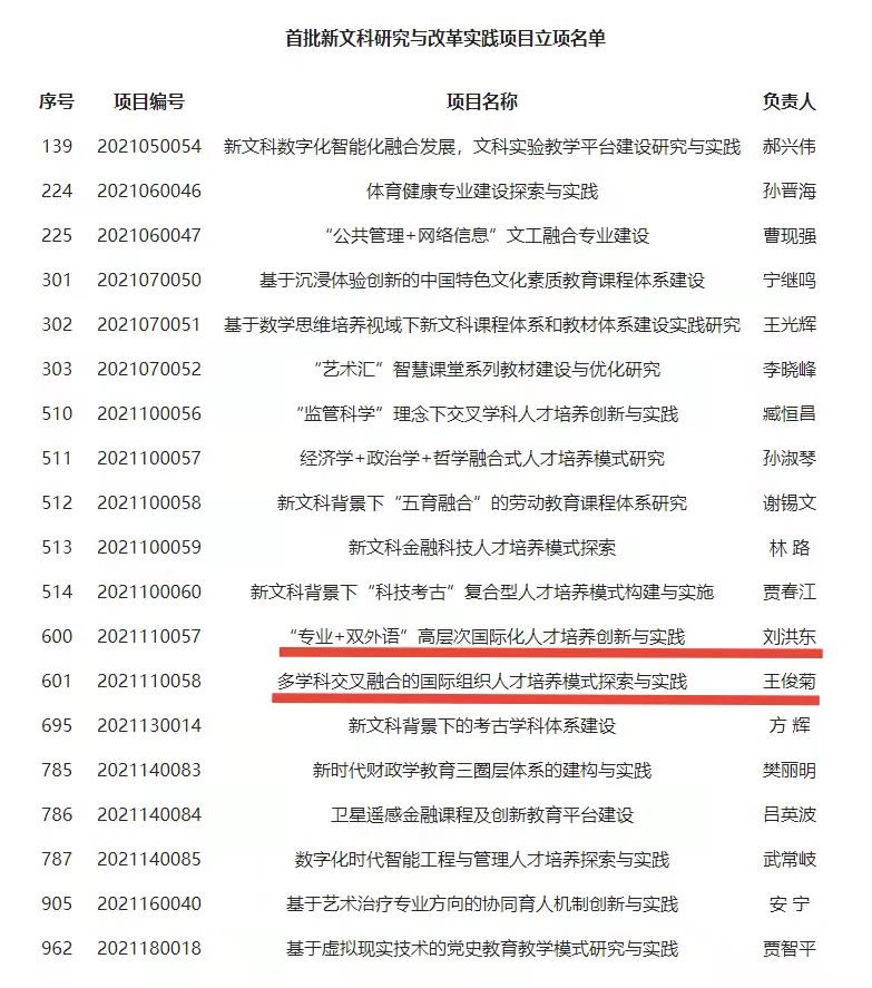 近日,教育部办公厅公布了首批新文科研究与改革实践项目立项名单,必赢76net线路唯一官方网站19个项目获得立项。其中,必赢76net线路唯一官方网站2个项目入选,分别是王俊菊教授主持的《多学科交叉融合的国际组织人才培养模式探索与实践》,刘洪东副教授主持的《“专业+双外语”高层次国际化人才培养创新与实践》。