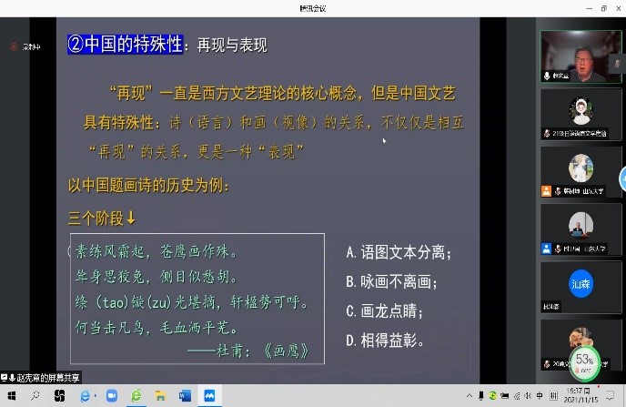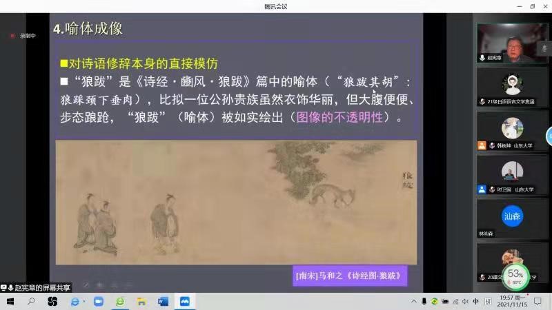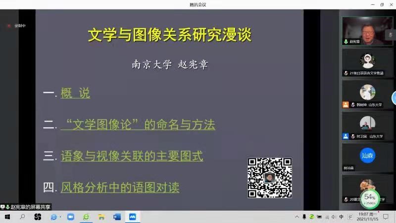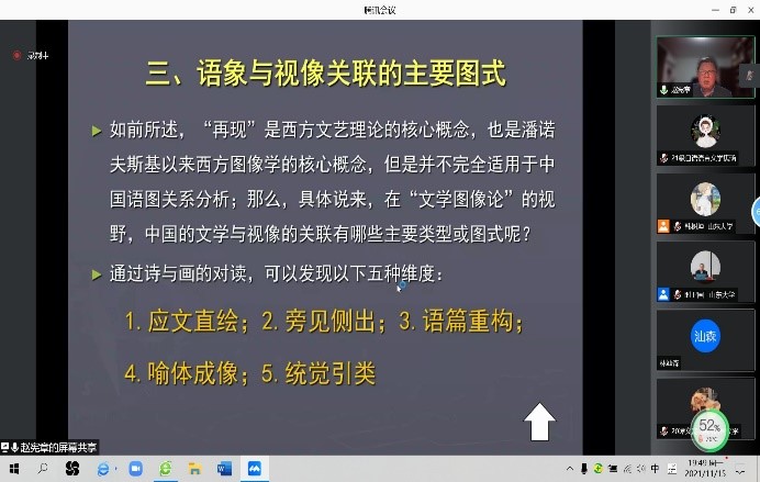 11月15日晚,著名文艺理论家、中国文艺理论学会副会长、南京大学文学院教授、博士生导师赵宪章应邀做客东方文化大讲堂通识教育讲座暨“师说讲堂”,通过腾讯会议线上平台做了“文学与图像关系研究漫谈”的精彩讲座。来自山大校内外的300多名师生远程聆听。