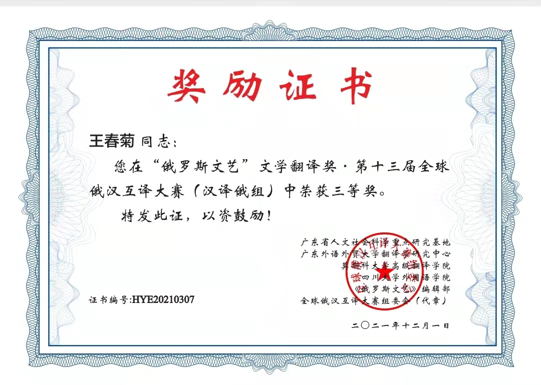 据悉,本次大赛分为俄译汉与汉译俄两个组别,经过国内外知名专家组成的评委经过初评和终评,大赛共决出一等奖10名,二等奖20名,三等奖30名。