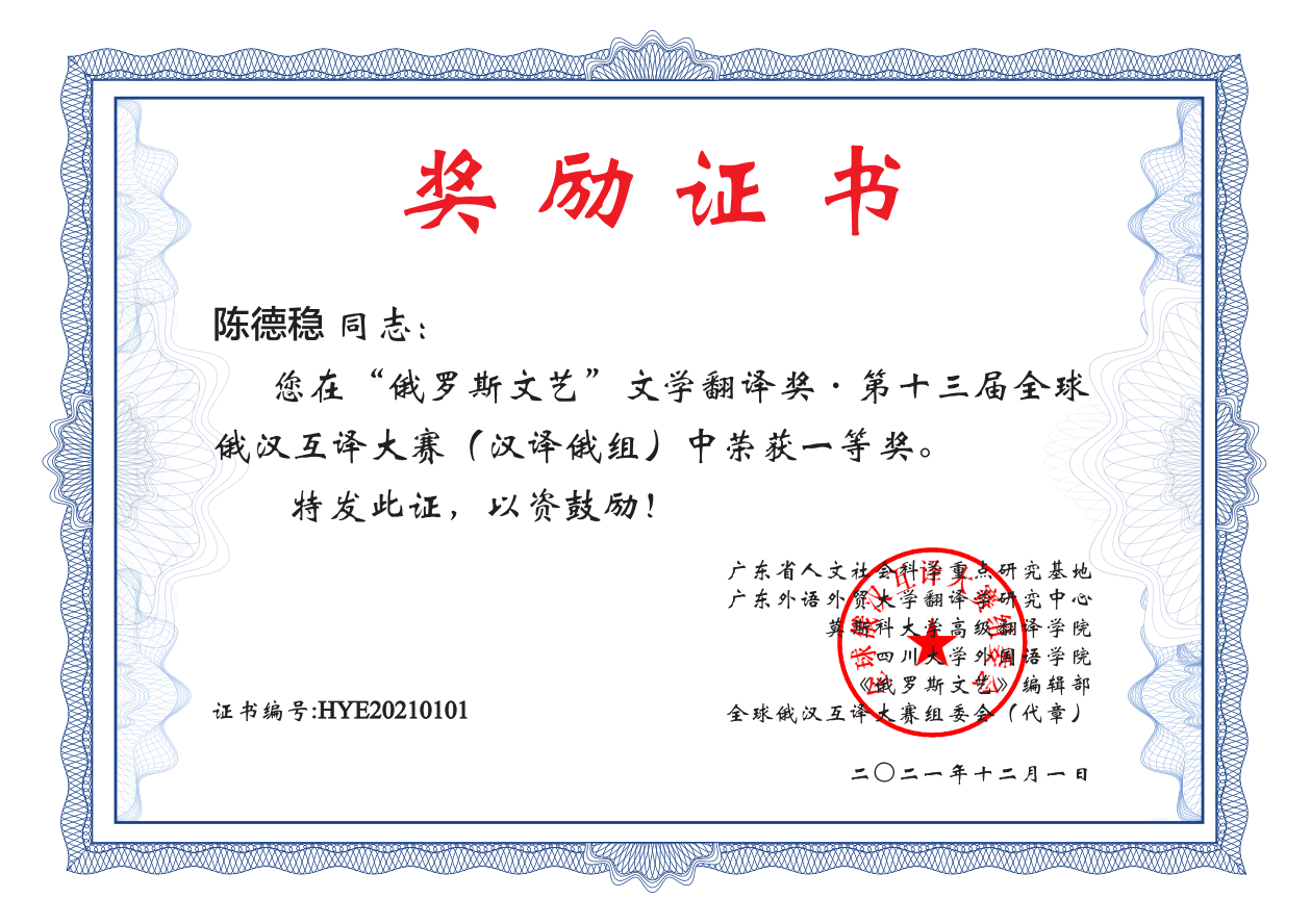 11月11日,第十三届全球俄汉翻译大赛获奖名单揭晓。必赢76net线路唯一官方网站俄语系硕士研究生陈德稳荣获汉译俄组一等奖第一名 ,17级本科生王春菊同学荣获俄译汉组二等奖及汉译俄组三等奖。必赢76net线路唯一官方网站获评优秀组织奖。两位同学获奖充分体现了我校俄语专业翻译教学与研究的特色,代表了山大俄语学生的翻译水平。