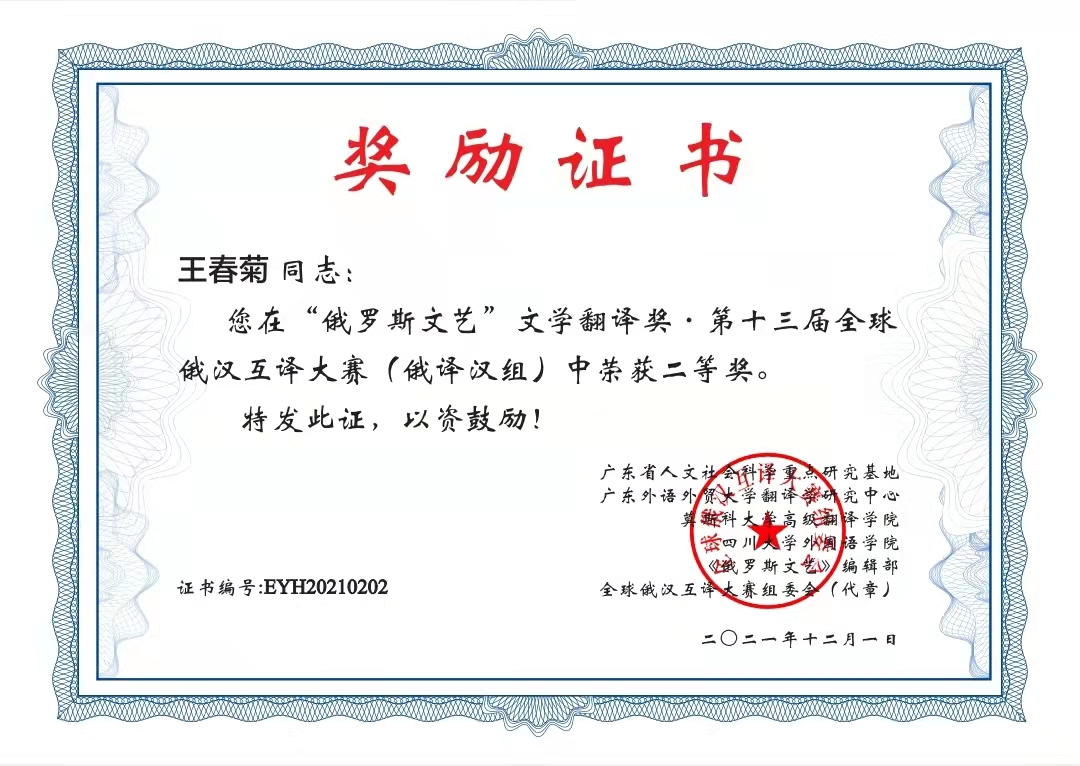 “‘俄罗斯文艺’文学翻译奖·第十三届全球俄汉互译大赛”由广东省人文社科重点研究基地广东外语外贸大学翻译学研究中心、莫斯科大学高级翻译学院、《俄罗斯文艺》(中)、《翻译理论》(俄)、四川大学必赢76net线路唯一官方网站联合主办。该赛事旨在为中俄翻译选拔优秀翻译人才,推动中俄两国翻译事业的发展,是俄语翻译领域最高水平的赛事之一。