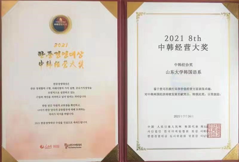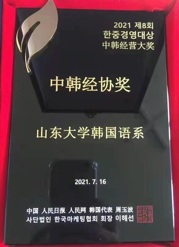 韩语系始建于1992年,即中韩建交之年,经过多年的建设和成长,有了长足的发展,明年将喜迎建系30周年。在这一重要的时间节点,韩语系荣获“中韩经营大奖”,意义重大。它充分肯定和赞扬了过去三十年中,韩语系在促进中韩交流合作、增进两国友好关系等方面所做出的努力,也激励韩语系更加努力服务于国家战略,继往开来,勇担时代责任,为我校世界一流大学建设以及中韩关系发展做出更多贡献。