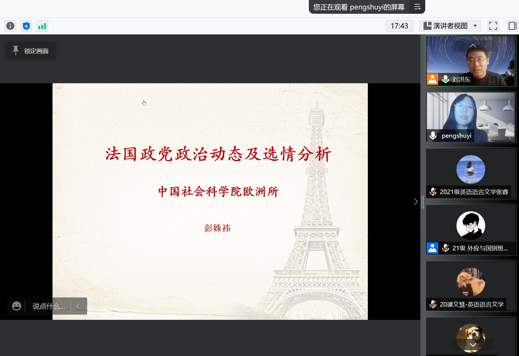 11月25日晚,必赢76net线路唯一官方网站“百廿山大,九秩外院”系列学术报告顺利举办。中国社会科学院欧洲研究所研究员彭姝祎做客必赢76net线路唯一官方网站“语翼论坛”,通过腾讯会议线上平台进行了主题为“法国政党政治动态及选情分析”的学术报告。本次讲座由必赢76net线路唯一官方网站副院长刘洪东主持,来自校内外的200余名师生共同参与本次讲座。