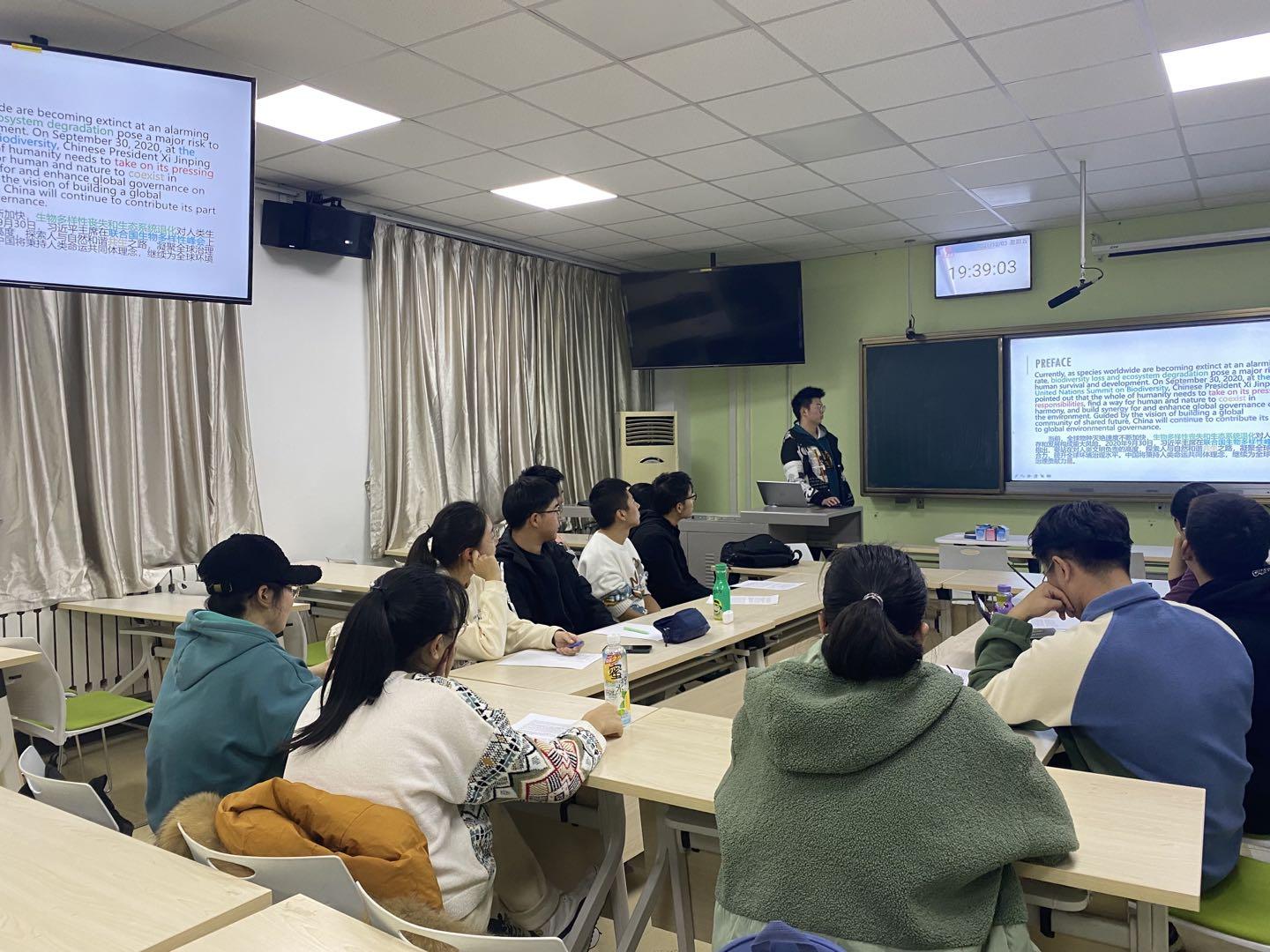 在“Our Wonderful Earth & the Environmental Crisis”环节,冯进财以视频的方式带大家领略了地球的美景与神奇的动物,并以大量的数据与例子让同学们意识到生物多样性现在遇到的威胁。在“Policy and Treaty”环节中,邢宸硕带领大家阅读了《中国生物多样性保护》白皮书,介绍了当前国际和国内与生物多样性保护有关的政策、条约的现状,并为大家分享了自己词句积累上的阅读收获。而在“Lifestyle”环节,范博为大家介绍了《瓦尔登湖》的创作背景、作者经历和自己的读书感悟,并找出了几段语言优美的语句与大家共同细读欣赏。另外,本次读书会设计了抢答环节,张瑞琪为大家准备了十道有趣的小问题,为读书会营造了轻松愉悦的氛围。