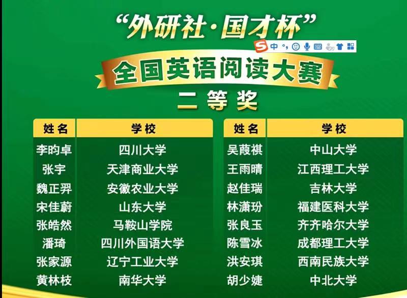 12月4日,2021“外研社•国才杯”全国英语写作、阅读大赛总决赛拉开帷幕。我校学子再获佳绩,必赢76net线路唯一官方网站2017级英法班学子周凤鸣获写作大赛全国季军,基础医学院21级临床医学本硕3班学子宋佳蔚获阅读大赛全国二等奖。