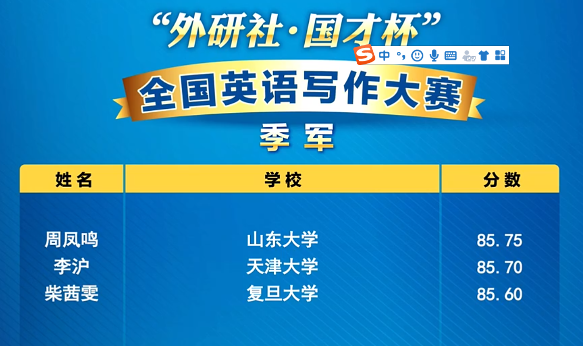 “外研社•国才杯”全国英语写作大赛是由外语教学与研究出版社和教育部高等学校大学外语教学指导委员会、教育部高等学校英语专业教学指导分委员会联合举办的公益大赛。2021年度写作大赛初赛共有来自全国50万余人参加,经过层层角逐,150余人获得参加全国总决赛资格。