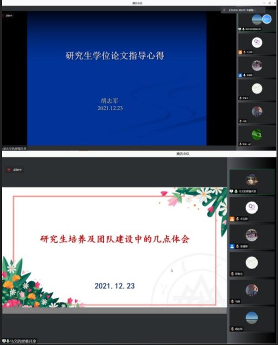 随后,学院优秀导师代表马文副院长和胡志军教授就学位论文指导及研究生培养问题与导师们进行了经验分享。胡志军老师以《研究生学位论文指导心得》为题,从“多种方式、学习提高”“全面了解、深入领会学位论文规范特点”“积极推进论文写作进程”三个方面详细介绍了其学位论文指导经验;马文副院长以《研究生培养及团队建设中的几点体会》为题,强调了研究生培养的重要性,并从“以人为本,课程育人”“学科交叉,科研育人”“国际、国内交流,合作育人”“项目协作,实践育人”等方面分享了其研究生培养的经验。就研究生团队建设问题,马文副院长建议学术研究追求卓越,遵循四个面向;建立组会制度,培养学生研究兴趣;加强团队建设;建立激励机制,提升学生科研热情;团队建设应具有理工思维等。