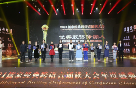 本次大会面向海内外中国文化爱好者,征集中外文两种语言诵读儒家经典原文的视频作品,语种涉及中英、中法、中俄、中西、中日、中德、中韩、中葡共八种双语。根据专家团品鉴以及网友点赞数量选出60件作品进入线上展演环节,最终评选出“十佳双语传诵人”10组,“优秀双语传诵人”15组并在年度盛典现场进行颁奖。我院学子在韩语系陈媛老师的悉心指导下,凭借在作品“儒家经典朗诵《大学》”中的精彩表现和出色的展演能力,在3200余件作品中脱颖而出,最终成功获评“优秀双语传诵人”荣誉称号,韩语系学子王佳程作为学生代表上台领奖。