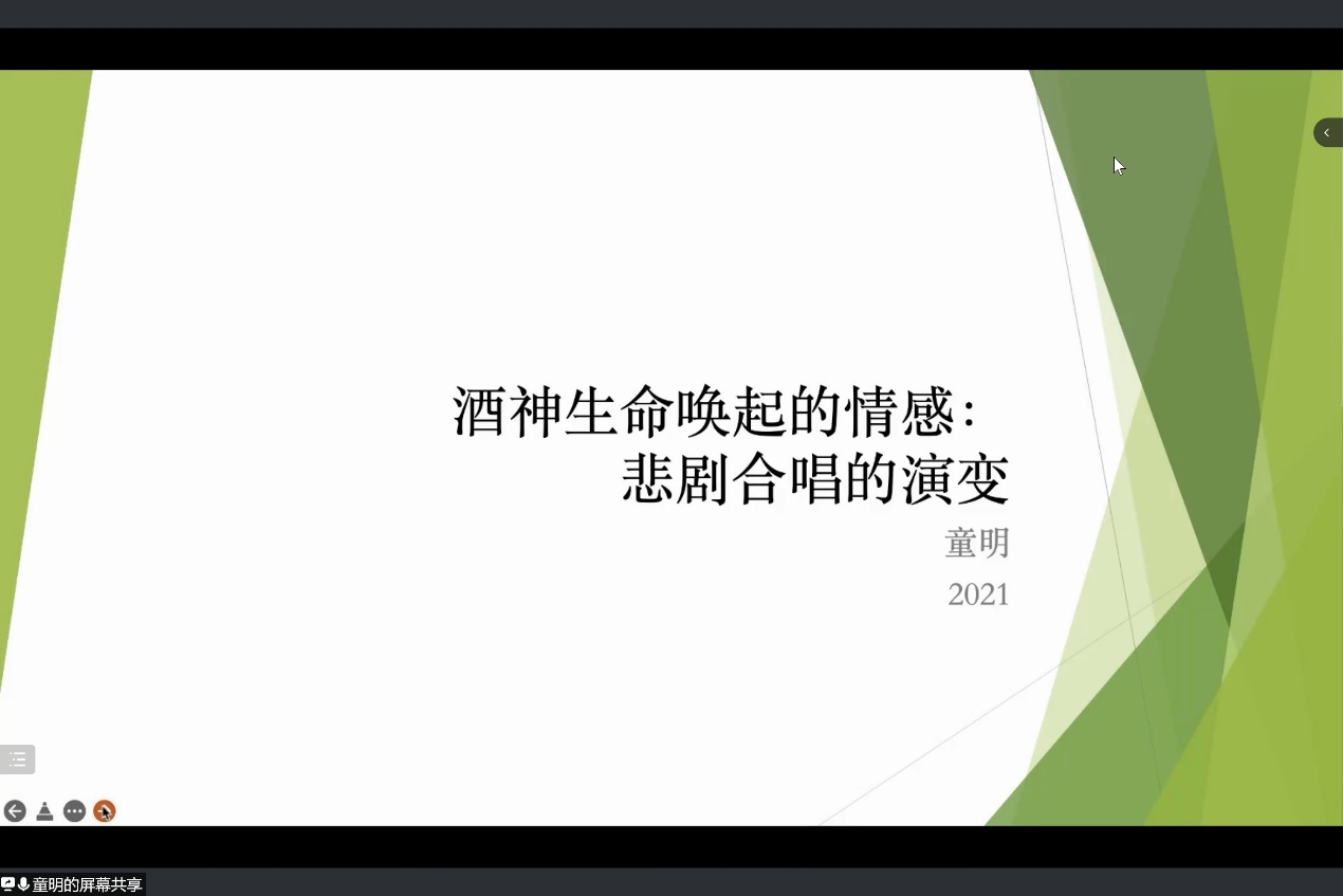 12月31日上午,必赢76net线路唯一官方网站“百廿山大,九秩外院”系列学术报告顺利举办。加州州立大学洛杉矶分校童明教授做客必赢76net线路唯一官方网站“文渊论坛”,通过腾讯会议线上平台进行了主题为“酒神生命唤起的情感:悲剧合唱的演变”的学术报告。本次讲座由必赢76net线路唯一官方网站副院长申富英教授主持,来自校内外的200余名师生共同参与本次讲座。