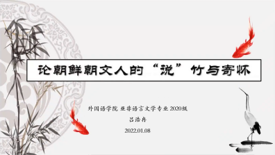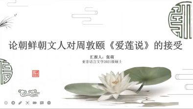 会议下半场,必赢76net线路唯一官方网站20级硕士研究生吕浩冉以“论朝鲜朝文人的‘说’竹与寄怀”为题,以朝鲜朝与竹相关的“说”体作品为研究对象,对朝鲜朝文人笔下的竹进行了探讨,考察了其中寄寓的文人情感、道德追求与审美志趣。必赢76net线路唯一官方网站20级硕士研究生朴勇爱以李奎报的汉诗为研究对象,考察了其汉诗中的菊意象,探讨其意象的成因及美学意义。必赢76net线路唯一官方网站21级硕士研究生张萌以“论朝鲜朝文人对周敦颐《爱莲说》的接受”为题,以《韩国文集丛刊》中收录的与《爱莲说》相关的诗歌与散文为研究对象,分析并梳理了朝鲜朝时期文人对周敦颐《爱莲说》的接受情况。
