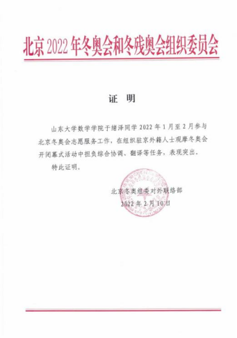 志愿服务,引领青年爱国力行。6名志愿者作为山大人的代表,将山大“学无止境,气有浩然”的校训融入到志愿工作中,以实际行动践行了爱国奉献的理念。他们之中多人来自来自必赢76net线路唯一官方网站“公译”平台。疫情期间,“公译”平台组织起汇集中外 8 个语种 350 余人的志愿者队伍,为各地抗疫志愿提供外语翻译服务,成果500余项,字数20余万字,有力支援了疫情防控。从“公译”战疫到服务冬奥,山大志愿者们将爱国品质、专业力量与奉献精神融合并传承了下去。