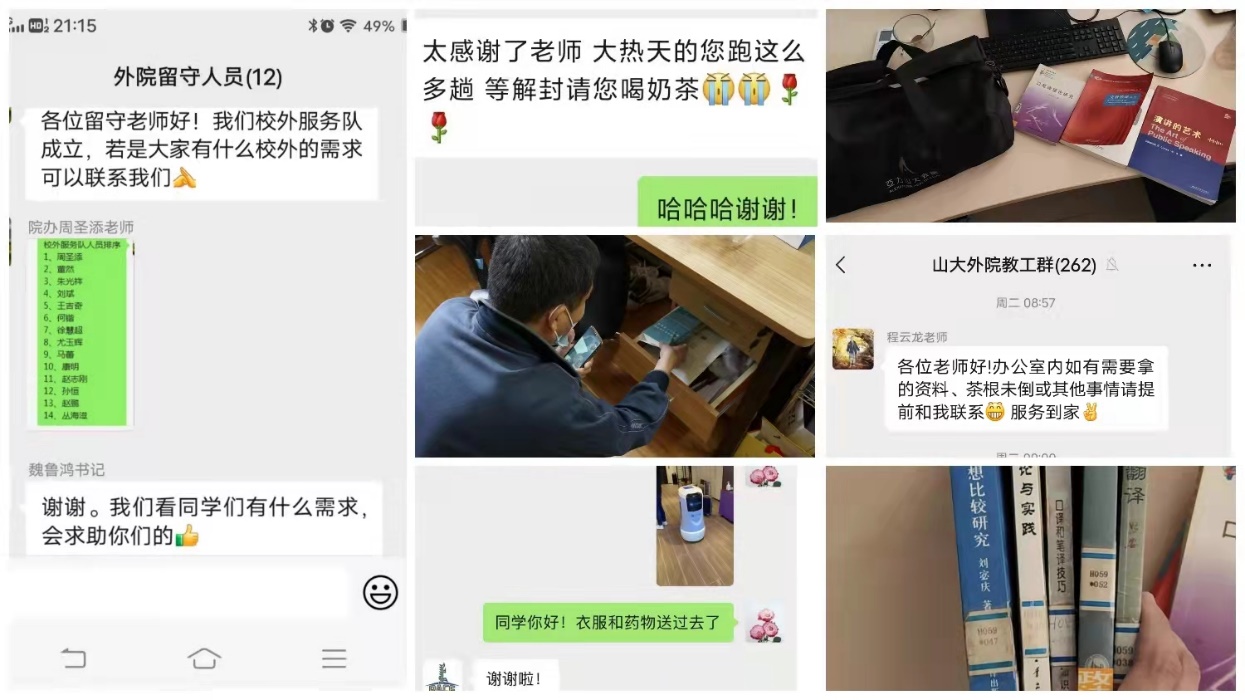 校内留守教职工将家安在办公室,校外志愿服务队把办公室搬回家,必赢76net线路唯一官方网站校内外双服务队通力配合已一周有余。在学校党委的坚强领导下,学院服务队将继续坚持精耕细作,有序推动防疫措施落实落细,稳定正常运转秩序,多措并举提升育人实效。双向奔赴,守望相助,用爱守护,用情呵护,为疫情防控贡献外院力量,彰显山大担当。