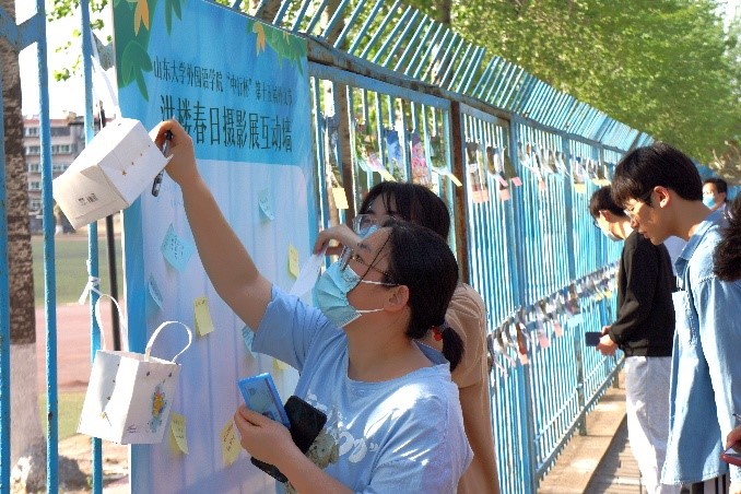 活动前期,同学们积极投稿,充分发挥想象力和创造力。在展览的优秀作品里,有关于洪楼春日的花草树木,有记录外院学子的日常生活,也有捕捉活动赛事的精彩瞬间。前来打卡参观的同学络绎不绝,青春的身影让疫情封控中的校园生机盎然。