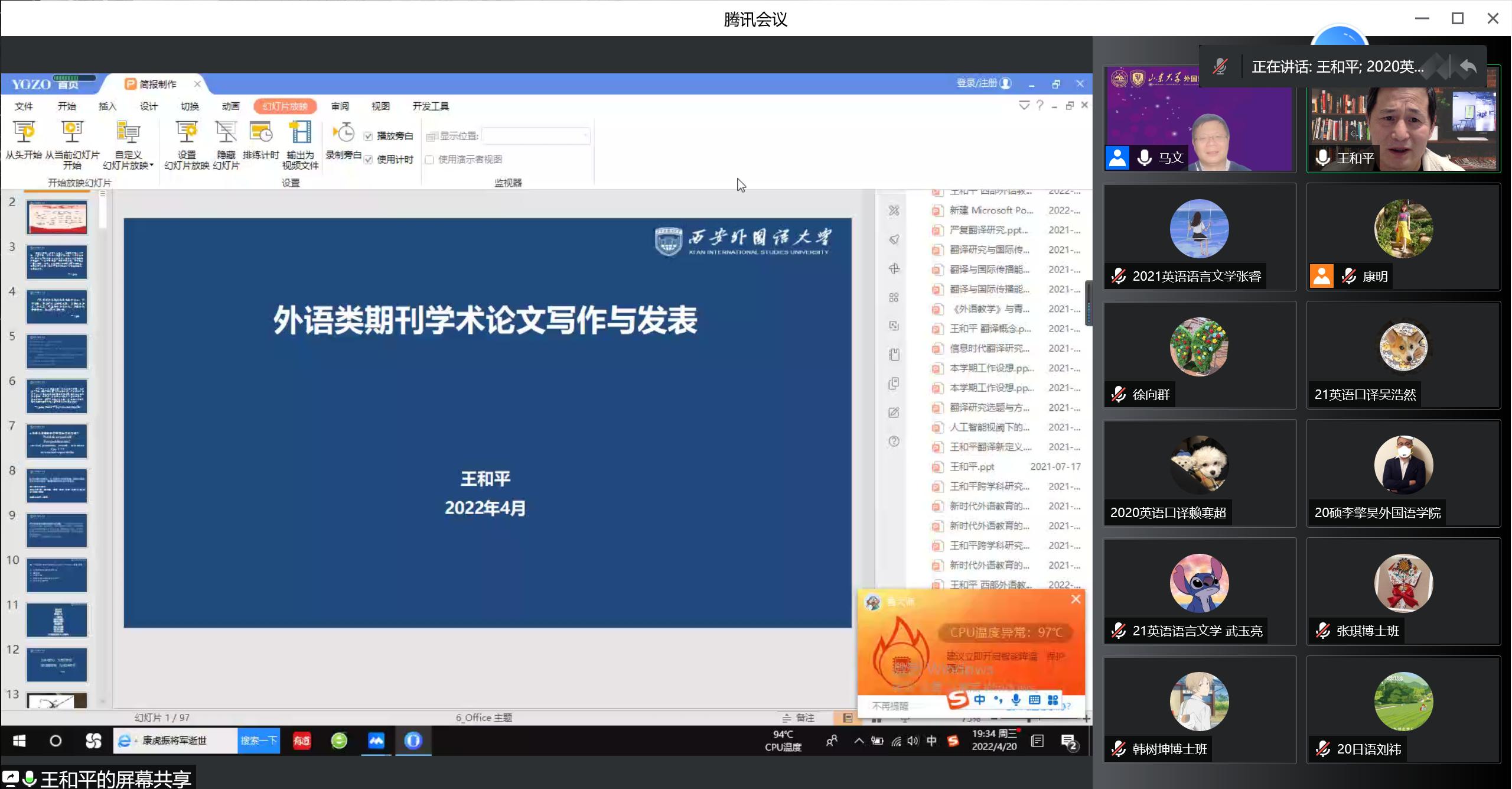 为了深入实施“学术兴院”战略,不断优化学术生态,开展卓越研究、特色研究,促进学院师生学术论文发表,必赢76net线路唯一官方网站于近期举办“2022名刊主编沙龙”。4月20日晚,“2022名刊主编沙龙”第一期成功举办,学院特邀《外语教学》执行主编、西安外国语大学王和平教授,通过腾讯会议线上平台进行了主题为“外语类期刊论文写作与发表”的专题报告。本次报告由必赢76net线路唯一官方网站副院长马文教授主持,来自校内外的300余名师生共同参与本次讲座,反响热烈。