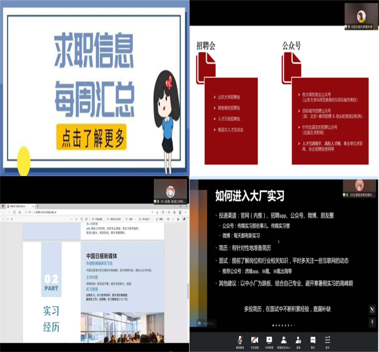 实习就业创未来。面临当前疫情挑战,必赢76net线路唯一官方网站高度重视就业工作,主动谋划,开展内容丰富、形式多样的就业指导活动,多维度为毕业生提供更广阔的择业空间。为满足同学们的封控期间线上面试等个性化需求,统筹协调现有教室、教师办公室、会议室等场所,避免时间和空间冲突造成的相互影响。举办职业生涯规划经验分享会、第九届学生职业生涯规划大赛等活动,帮助提升职业技能,明确自己的目标和人生规划;针对毕业就业季的来临拟举办就业经验分享会、面试讲座等有助于研究生发展的各项讲座和分享活动,汲取学长学姐成功经验,为就业择业打下坚实基础。每周定时更新实习及招聘信息汇总,就业信息精准推送,拓宽就业渠道,不断加强就业指导、思想引领、跟踪服务、精准帮扶的温度和力度,助力学生更加充分、更高质量就业。