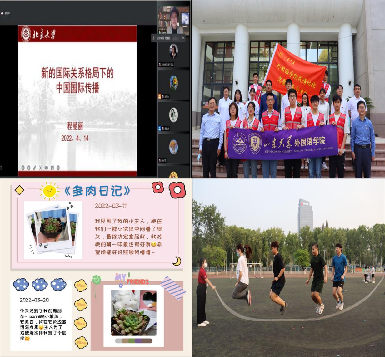 文体活动激活力。学院在严格遵守疫情防控要求的前提下,以学生组织、党团支部为依托积极开展丰富的文体活动。学院积极调集学术资源,举办云端系列学术讲座,每周2-3场,已组织8场学术报告,内容涉及俄乌局势、国际传播、学术写作、研究方法等,每场学术报告的听众均超过300人。此外,还举办绿植领养、“洪楼时光留声机”云歌会、“中行杯”外文节随机舞蹈洪楼站等多项趣味活动,为校园增添青春活力;举办运动嘉年华系列体育活动,包括:“疫”起自律运动打卡、各式趣味运动以及羽毛球赛,鼓励同学们“走下网络、走出宿舍、走向操场”,以户外开展小范围体育活动的方式切实增强学生体魄,以健康身心从容应对疫情的挑战;举办“中行杯”洪楼春日摄影大赛、“疫情下的青年担当”主题团日升旗仪式、“读原著、享美文”外文书法大赛、研究生文化交流微视频大赛等美育活动,丰富大家在校园封闭管理期间的课余生活,通过发现美好,传递爱、祝福与希望,激励同学们守望相助、攻克时艰,更有信心、有动力度过抗疫难关。
