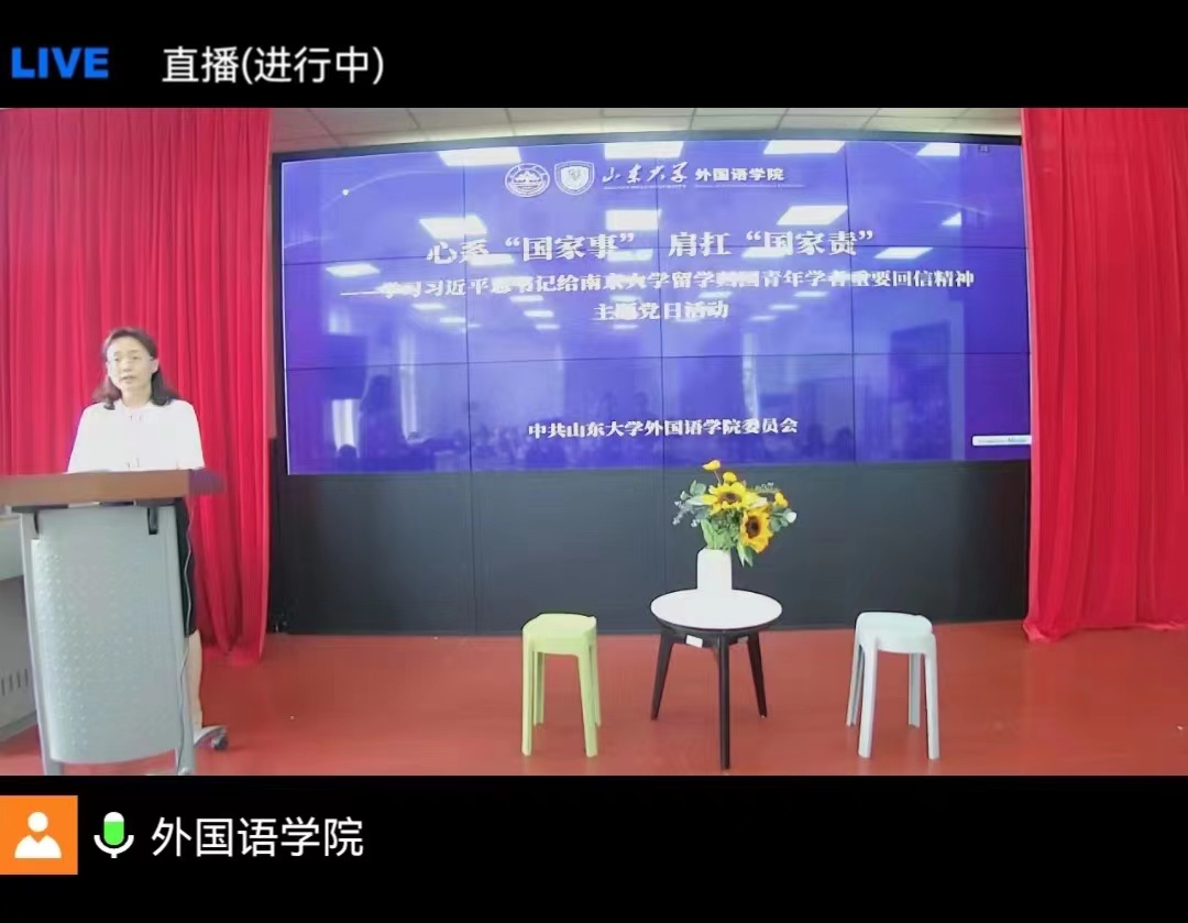 会议伊始,刘华领学《习近平给南京大学留学归国青年学者的回信》。随后,2021级硕士研究生第二党支部党员徐一凡作为学生党员代表与五位归国学者分别围绕归国入党感想、教学收获、智库建设、国际合作与交流和科学研究心得进行访谈。董记华谈到自己的入党原因和对习近平总书记回信精神的理解,希望更多海外留学青年学者讲好中国故事。张聪提出了以学生为中心,让课堂活起来,让学生动起来的教学理念,她指出在美国普渡大学执教期间体会到了文化多元性,要根据学生的特点和个性进行教学。李月珊指出高校智库是高校发挥多专业和学者的优势,贡献国家、培养人才的知识生产平台,能帮助提高国家软实力和帮助学校培养人才,促进个人的应用研究,服务国家,并分享了撰写智库报告的心得体会。薛琳分享了法国的工作经历对自己国内工作起到的积极作用,并指出相互尊重是国际交流合作的关键,在疫情期间应积极利用线上资源开展有效的国际交流活动,实现语言互助,资源互补。冯伟谈到留学归国青年科研工作者应该吸收国外先进经验,丰富中国学术和大学教育,并提出跨文化研究要促进中国文化传播,留学归国青年教师在进行科研工作中掌握先进方法,为中国发声。