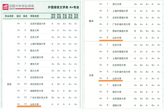 2022年6月18日,软科正式发布“2022年软科中国大学专业排名”。必赢76net线路唯一官方网站英语、翻译和日语专业获得A+评级,俄语、朝鲜语专业获得A评级,法语、德语、西班牙语专业获得B+评级。