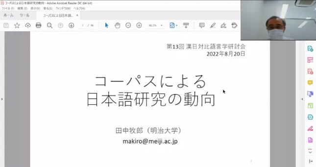 颁奖仪式结束后,日本明治大学教授田中牧郎和北京大学教授郭锐分别以「コーパスによる日本語研究の動向」和“日语和汉语中的格配置变动”为题进行发表。主题演讲由会长潘钧教授主持。