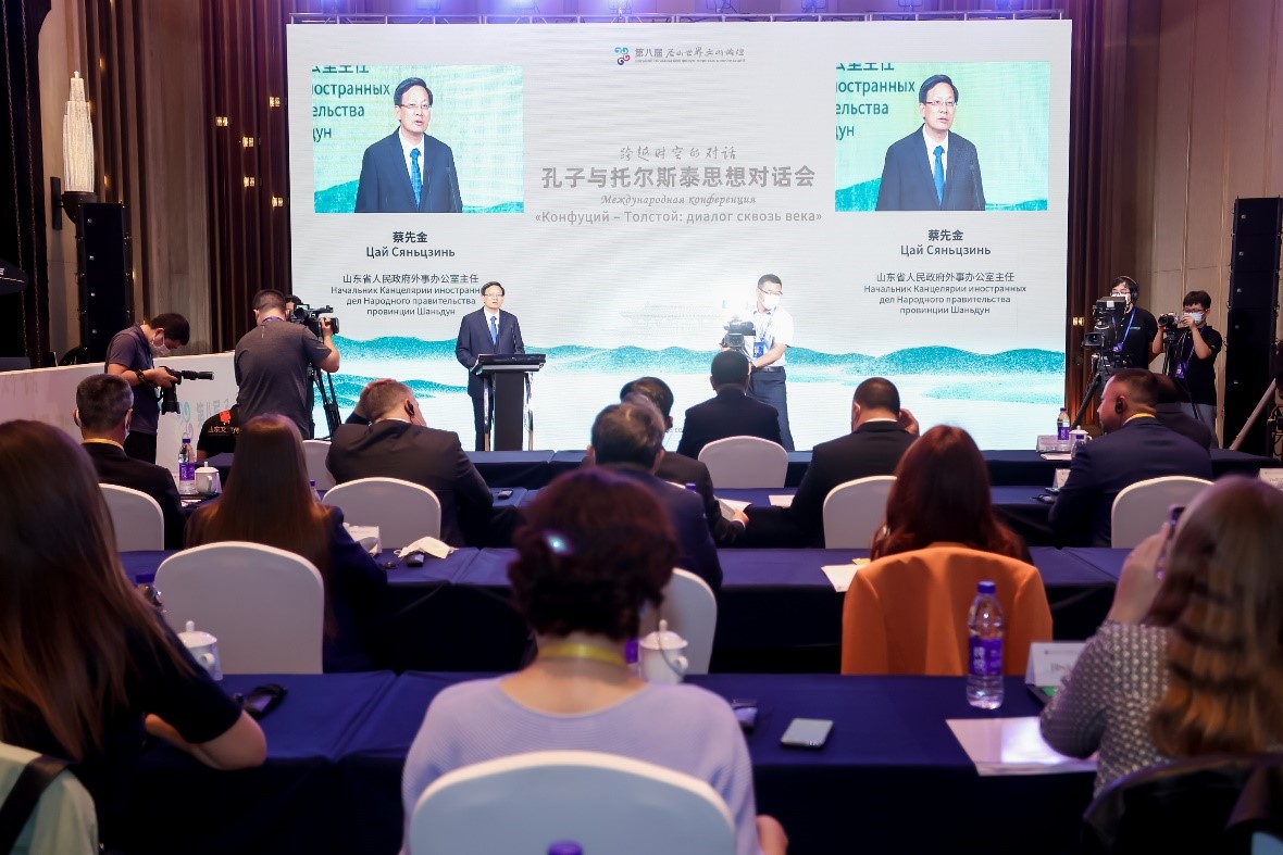 此次研讨会由山东省人民政府外事办公室、尼山世界儒学中心和国际俄语教师协会联合主办,中国外国文学学会俄罗斯文学研究分会协办,必赢76net线路唯一官方网站承办。主会场设在曲阜尼山,在俄罗斯圣彼得堡设分会场,莫斯科、北京、上海、济南等地专家学者通过ZOOM会议系统线上参会。俄罗斯联邦总统文化顾问、国际俄语教师协会主席托尔斯泰,世界孔子后裔联谊总会会长孔德墉,中国驻俄罗斯联邦大使张汉晖,俄罗斯驻华大使馆公使斯捷普基娜,北京大学副校长宁琦,国际俄语教师协会秘书长勃鲁诺娃等也通过线上或视频方式在开幕式上致辞。开幕式由山东省人民政府外事办公室主任蔡先金主持。