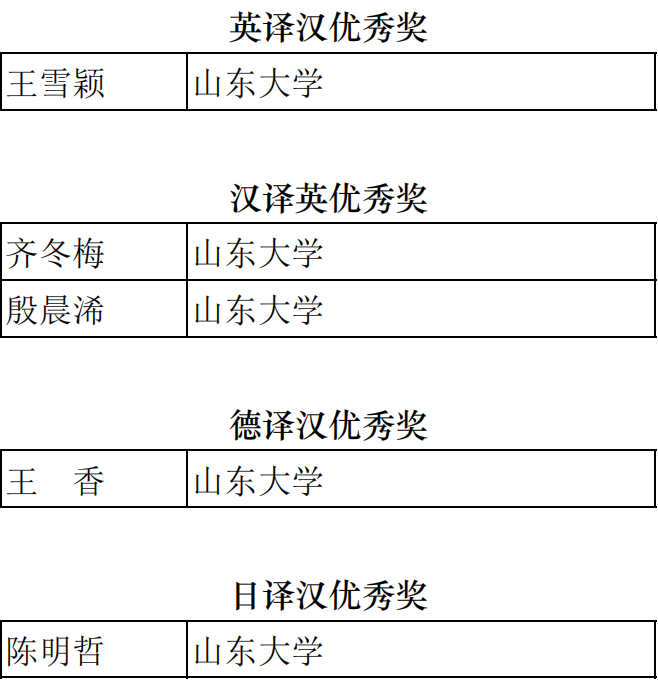 2022年11月16日,第三十四届韩素音国际翻译大赛获奖名单公布,必赢76net线路唯一官方网站的5名研究生及本科生同学取得优异成绩。2019级本科生翻译班王雪颖获得英译汉组优秀奖;2019级本科生英政班殷晨浠、2021级研究生英语笔译专业齐冬梅获得汉译英组优秀奖;2020级研究生德语语言文学王香获得德译汉组优秀奖;2021级研究生日语笔译专业陈明哲获得日译汉组优秀奖。