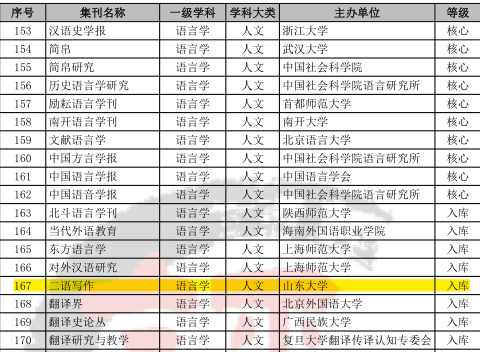 2022年,中国社会科学评价研究院新增中国人文社会科学学术集刊(AMI)评价,对中国大陆地区主办的403种学术集刊进行了评价。本次评选共有48种语言学集刊入选,其中核心期刊12种,入库期刊36种。
