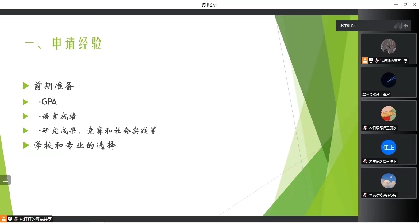 沈钰钰分享了英国硕士申请经验与学业要求,以及专业选择与求职的关系。她从申请经验、学业建议和回国就业三个方面进行分享,她分享了自己留学的前期准备:GPA、语言成绩和研究成果、竞赛和社会实践等,以及对于学校以及专业选择方面的经验。她建议同学们广泛阅读、锻炼批判性思维、用好学校的资源和不要拖延;在就业方面不要盲目跟风。最后,边楠茜、金狄和沈钰钰分别就学生们提出的问题做出了详细的解答,为同学们打开了眼界,建立了对留学的整体认知。