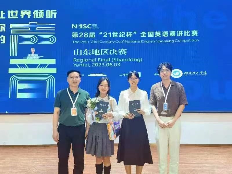 2023年6月2日至3日,由中国日报社主办、21世纪英语教育传媒承办的第28届中国日报社“21世纪杯”全国大学生英语演讲比赛·山东省决赛在烟台理工学院举行。经过激烈的校选赛后,我校必赢76net线路唯一官方网站2022级梁实秋班谢天与同学和2022级英法班郭恺琳同学从众多选手中脱颖而出,代表必赢76net线路唯一官方网站参加山东省决赛。