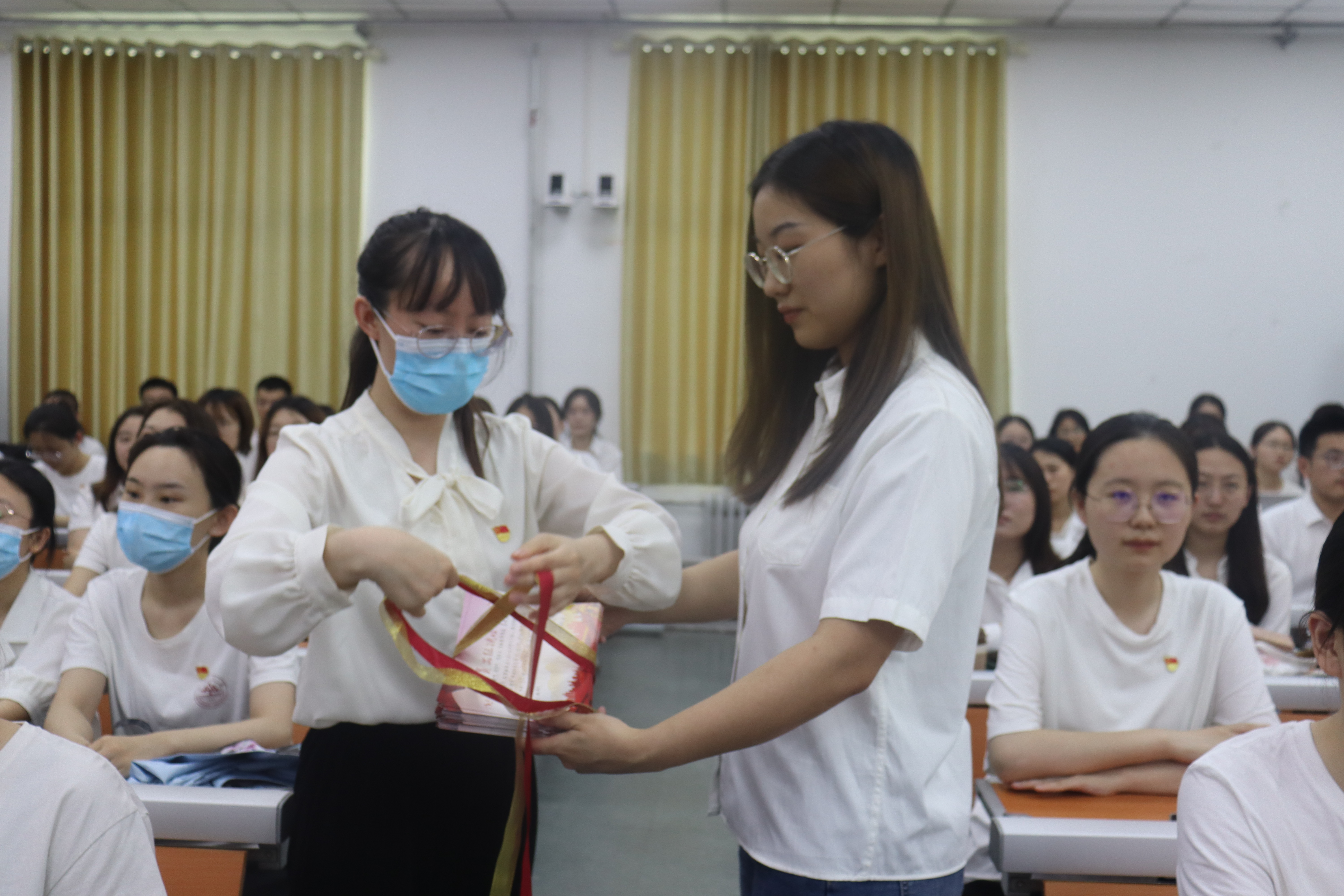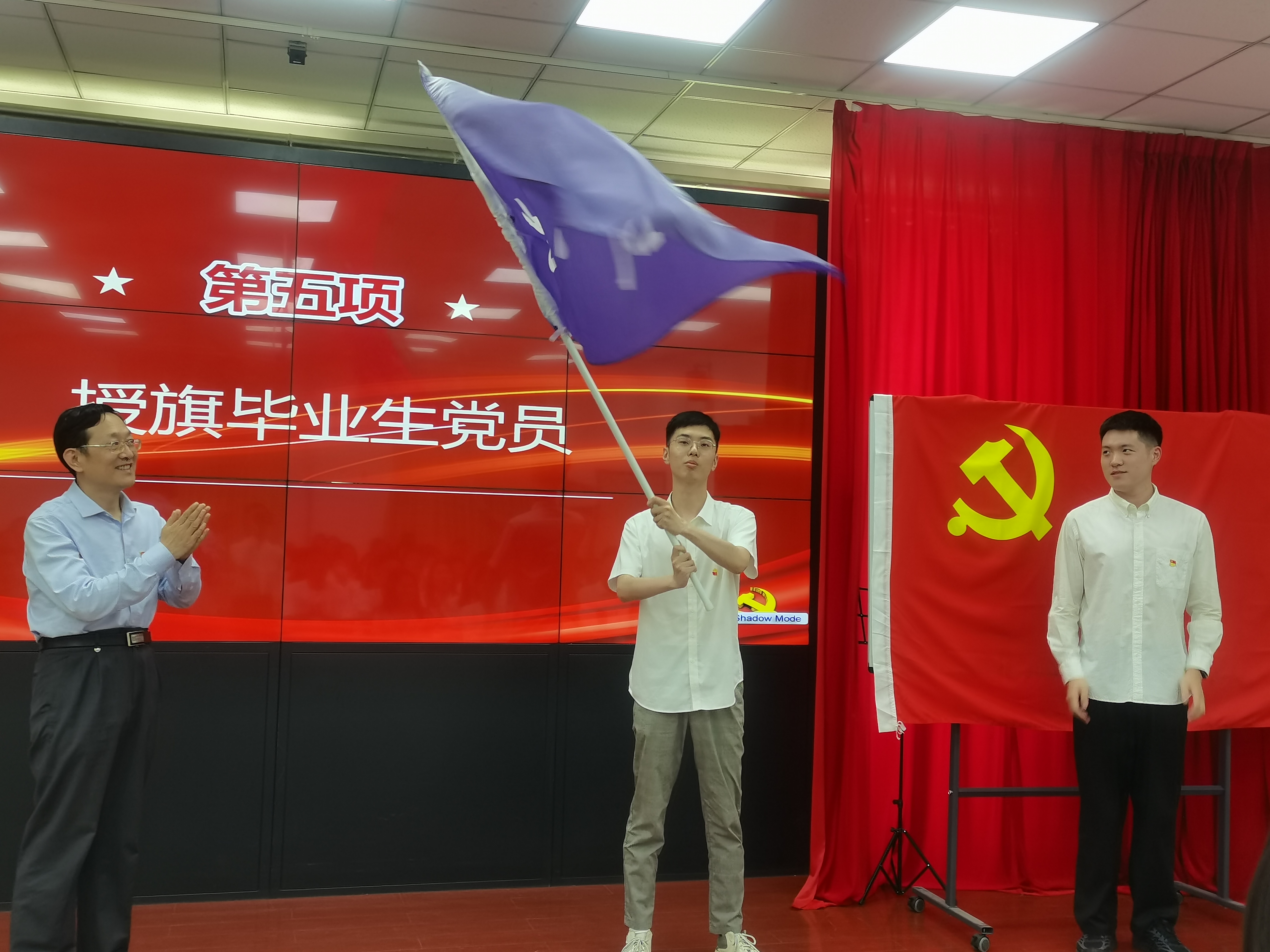 在授旗环节,党委书记薛佩军将印有“出征·启航”的旗帜交给毕业生党员代表徐博文。授旗的背后,是党员精神的传承,是学院对于毕业生党员的祝福和期望,愿大家肩负着党员的使命,投身到祖国大好河山的建设中去。