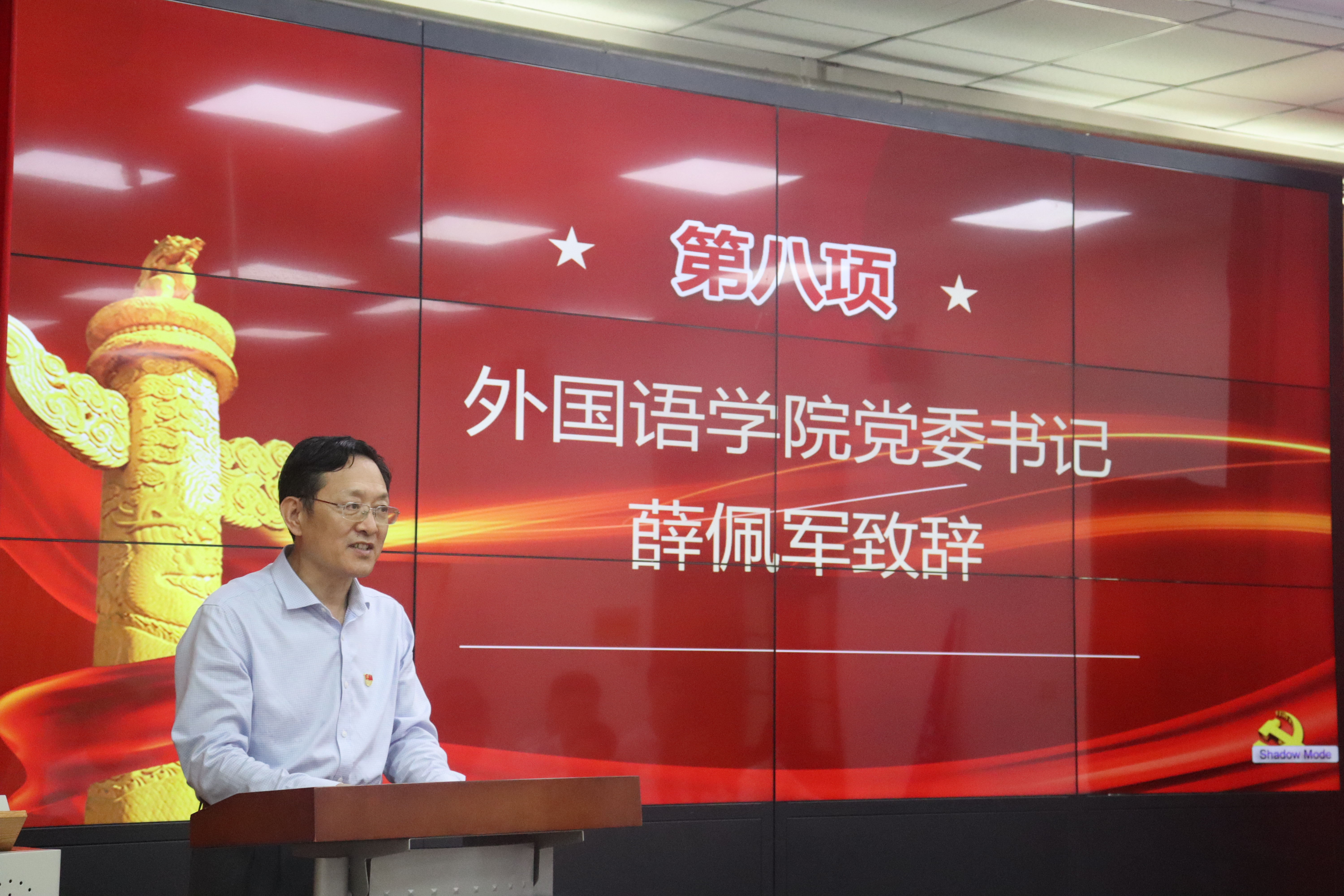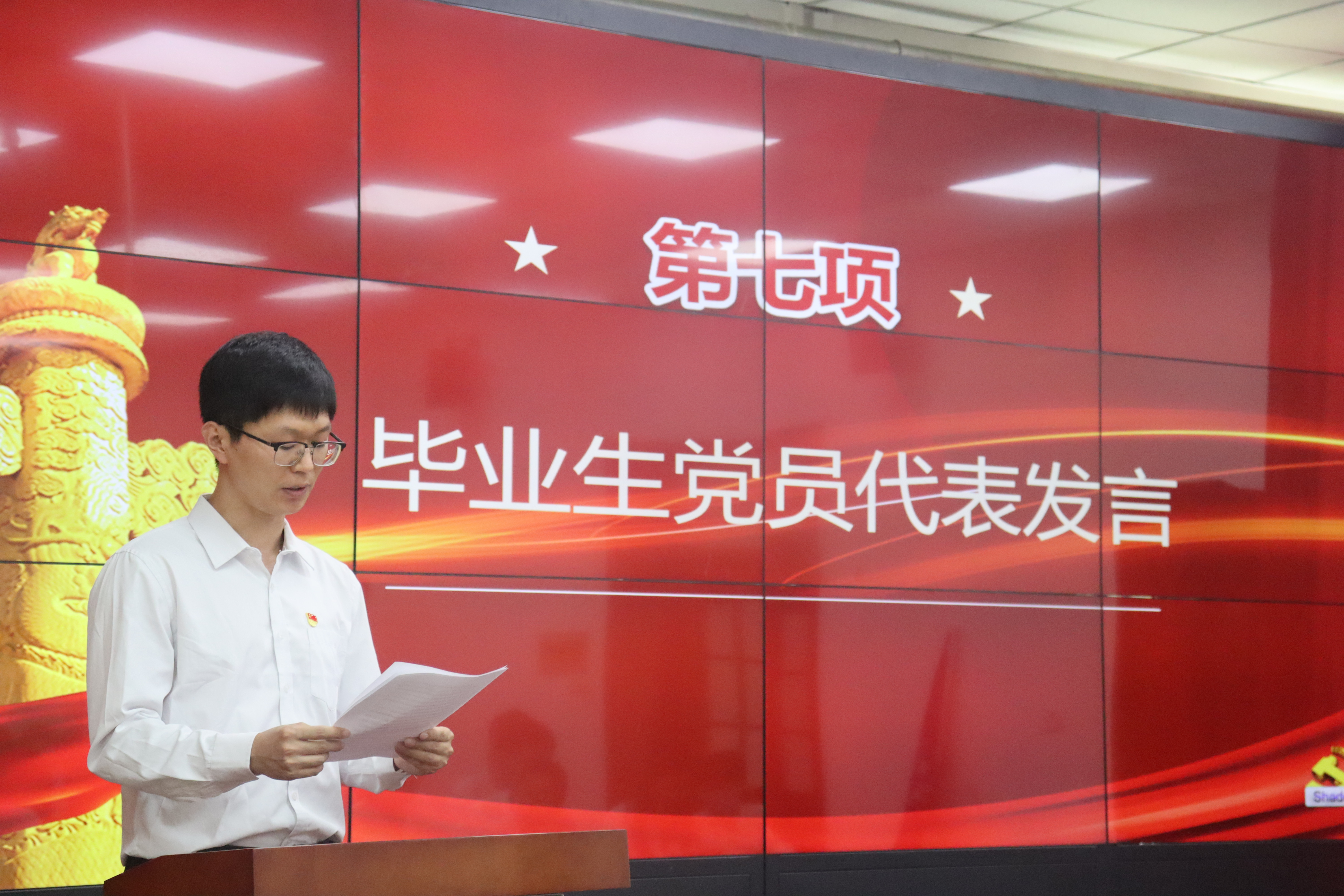 2020级英语语言文学专业吕鹏飞代表全体毕业生党员发言,他回顾了过去三年的党支部相关活动,对学院党委的组织领导表示感谢。此外,他对毕业生党员提出了三点号召,一、坚定理想信念,树立远大抱负;二、发挥专业本领,彰显党员担当;三、开拓国际视野,提高思想境界。