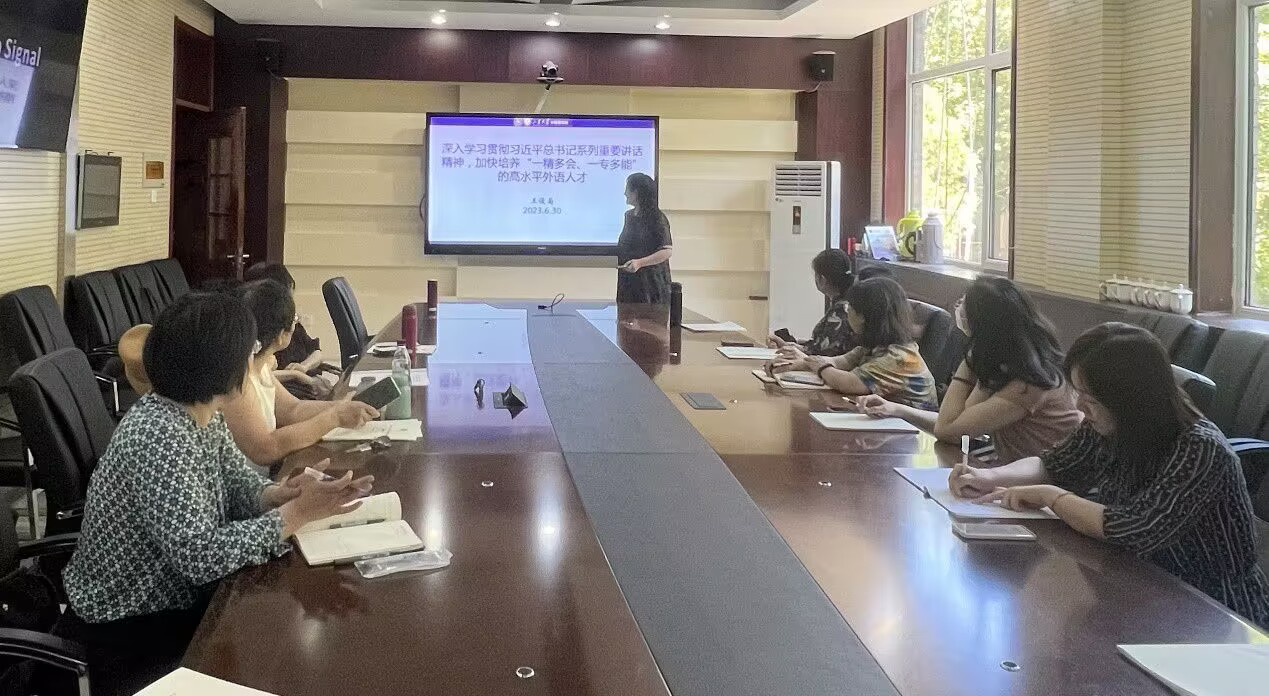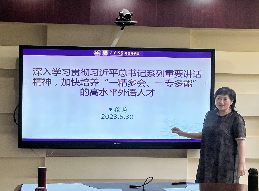 6月30日下午,为推动学习贯彻习近平新时代中国特色社会主义思想主题教育走深走实,必赢76net线路唯一官方网站院长、党委副书记王俊菊为教学团队第一党支部的党员老师们讲授了一堂题为“深入学习贯彻习近平总书记系列重要讲话精神,加快培养‘一精多会、一专多能’的高水平外语人才”的专题党课。