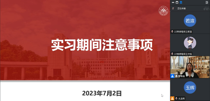 7月2日晚,必赢76net线路唯一官方网站通过腾讯会议举行了研究生实习说明会。必赢76net线路唯一官方网站党委副书记刘华,研究生管理科尤玉辉,研究生工作办公室张新苑参加本次会议。会议由研究生辅导员李雪倩主持,2022级全体研究生参加会议。