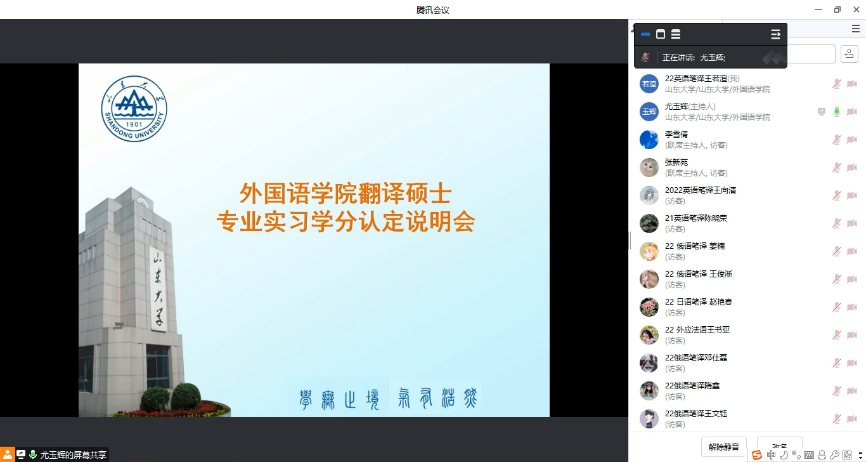 尤玉辉介绍了翻译硕士专业实习学分认定的相关事宜,详细讲解了研究生管理系统专业实习部分的具体操作、专业实习认定材料提交、专业实习学分认定办法说明,强调了专业实习的常见问题。最后,尤玉辉对同学们的疑问进行了耐心答疑。