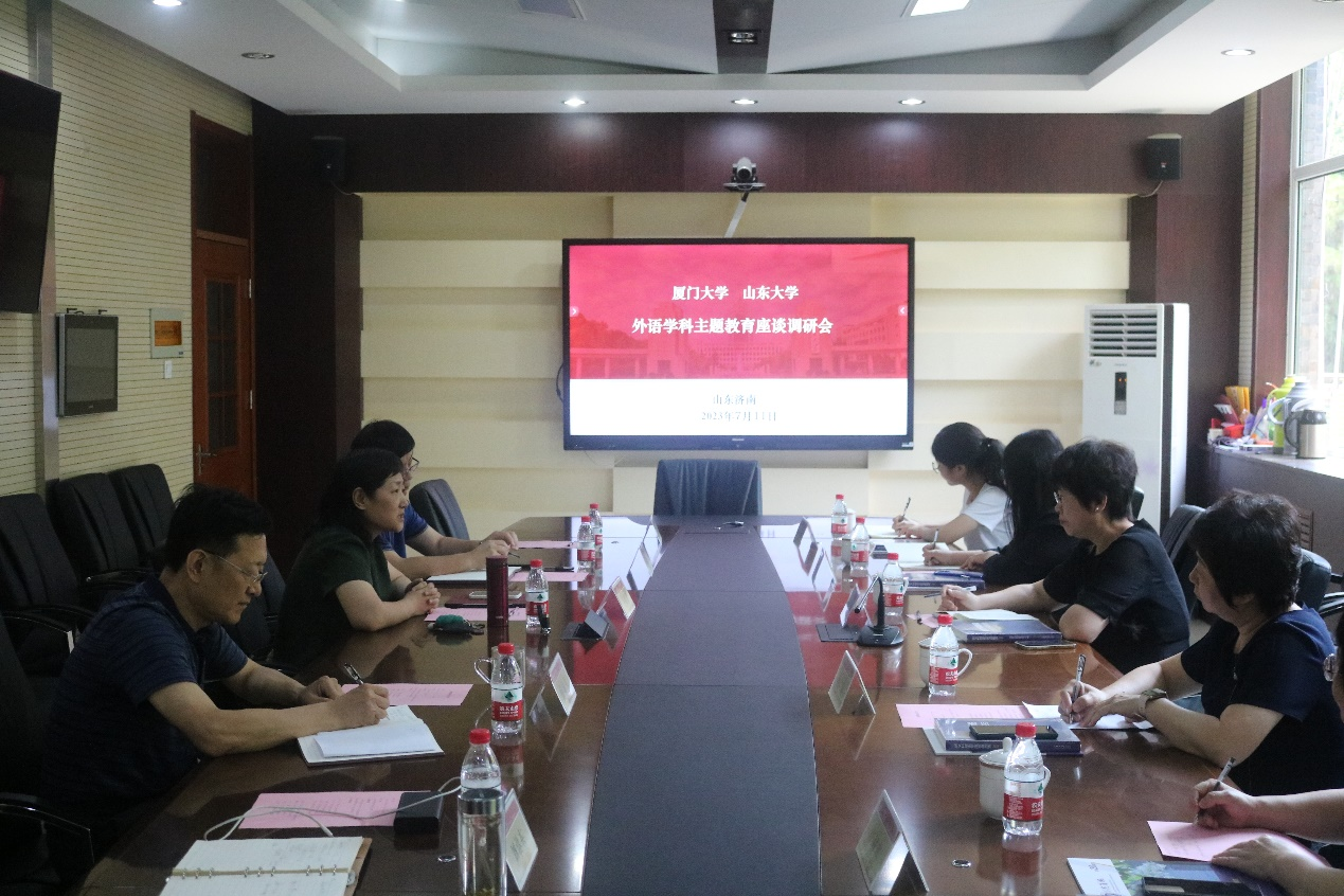 7月11日上午,厦门大学外文学院院长陈菁、党委书记徐琪、副院长江桂英、辛志英等一行五人来我院调研交流,学院院长王俊菊、党委书记薛佩军、副院长马文、刘洪东出席了本次两校外语学科主题教育座谈调研会。
