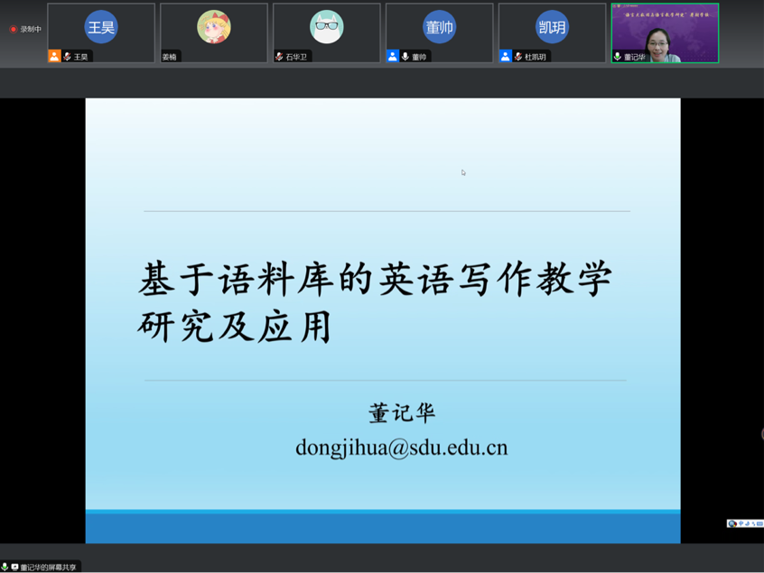7月17日,必赢76net线路唯一官方网站董记华教授为学员们带来了“基于语料库的英语写作教学研究及应用讲座”,在介绍语料库基本特征和使用优势的基础上,探讨语料库在英语写作教学中的常见应用范式,并结合最新实证研究探讨将语料库资源和工具应用于英语写作教学的方法,为学员在英语写作教学和研究提供了参考和借鉴。