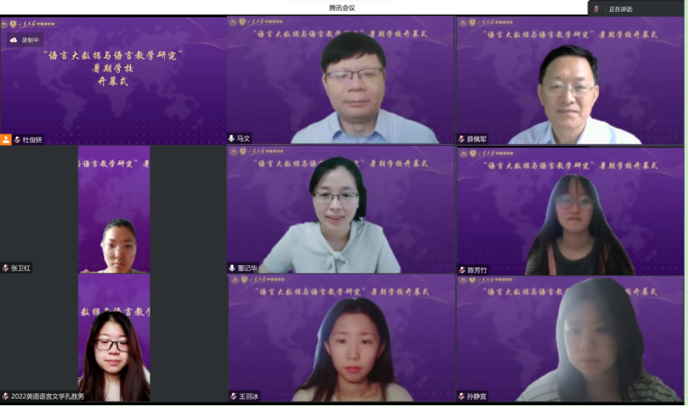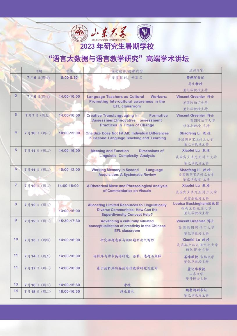 7月6日至7月18日,必赢76net线路唯一官方网站成功举办2023年“语言大数据与语言教学研究”国际暑期学校。本次暑期学校以“语言大数据与语言教学研究”为主题,邀请美国宾夕法尼亚州立大学Xiaofei Lu教授、美国佛罗里达州立大学Shaofeng Li教授、新西兰大学Louisa Buckingham副教授、英国阿伯丁大学Vincent Greenier博士、吉林大学姜峰教授和必赢76net线路唯一官方网站董记华教授六位知名学者,共进行11场前沿讲座,旨在提高语言学大数据与语言教学研究人才培养质量和科研创新能力,促进国内外高校师生的交流与合作。来自全国十余所高校的52位教师和研究生学员参与了本次暑期学校。