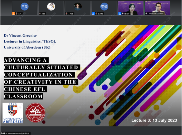7月6日至7月12日,阿伯丁大学Vincent Greenier博士相继带来了“Language Teachers as Cultural Workers: Promoting Intercultural awareness in the EFL classroom”、“Creative translanguaging in formative assessment: Innovative assessment practices in times of change”、“Advancing a culturally situated conceptualization of creativity in the Chinese EFL classroom”的语言教学系列讲座,讲述了英语教师如何在教学中构思跨文化意识,梳理了基于中国英语教师半结构式访谈展开的数据分析研究,并强调教师对于创造力的概念化教学至关重要。通过交流,学员们对教师的角色定位、语言测评中的超语实践、以及语言教学中的创造性都有了深入了解,讲座的跨文化视角也为语言智能背景下的语言教学提供了更广阔的视野。