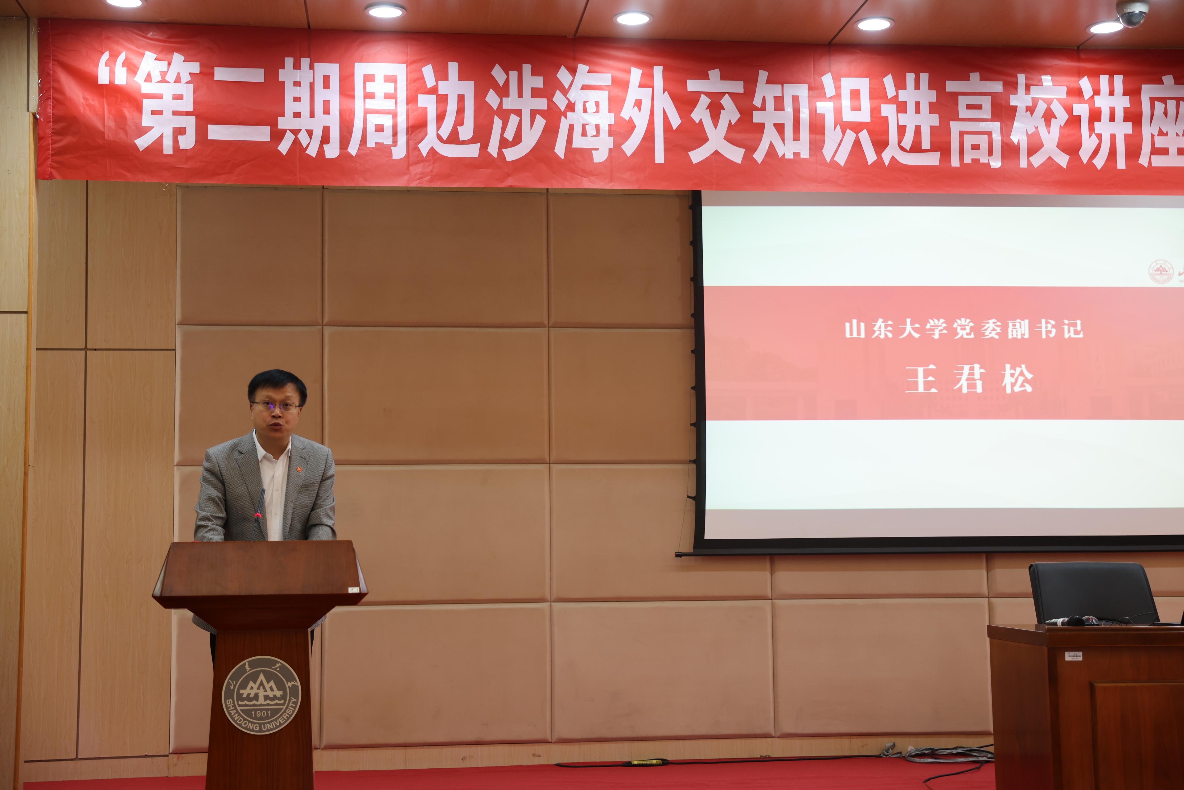 10月25日下午,由外交部、教育部、中国海洋发展基金会联合主办的“第二期周边涉海外交知识进高校”系列活动第一场在必赢76net线路唯一官方网站洪家楼校区法新楼举行。前外交部海洋事务代表周健参赞为我校师生作“外交工作和中国的边界海洋问题”主题报告,必赢76net线路唯一官方网站党委副书记王君松出席并致辞。