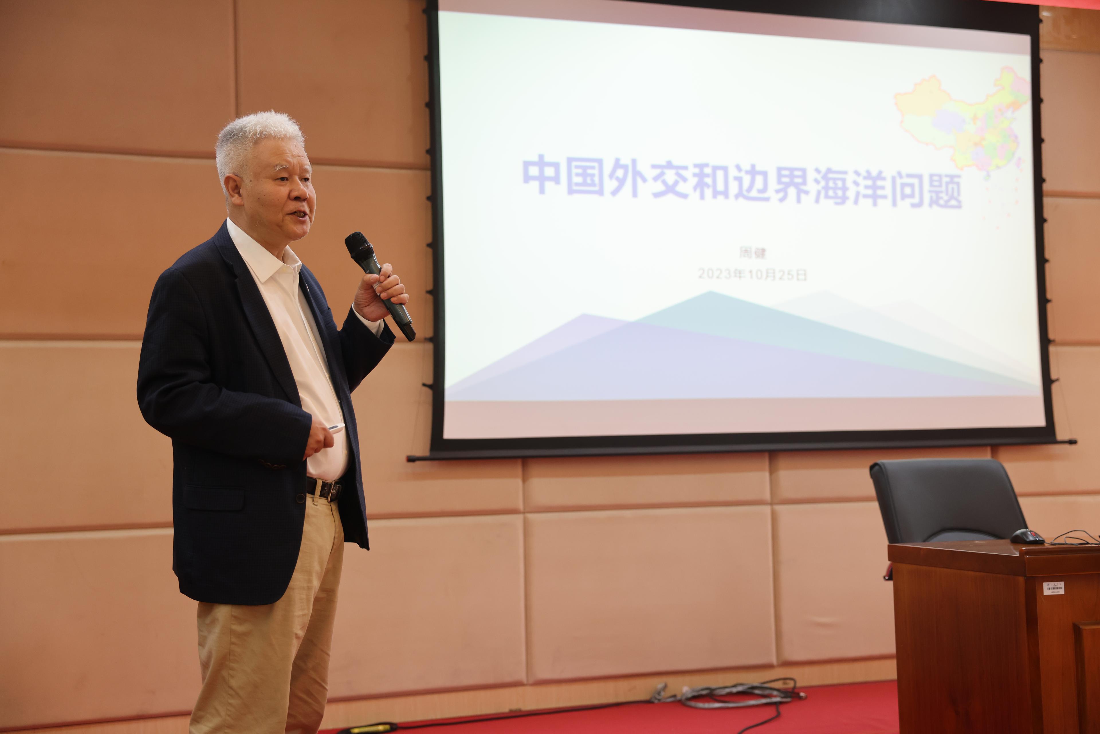 周健从中国外交大局中的边海外交形势导入,分别从中国同邻国的陆地边界问题、中国同邻国的海洋问题、新时期面临的海洋安全形势和挑战等方面进行了介绍。他结合个人工作经历,从历史与现状的不同角度,分析了中华人民共和国成立以来外交工作的演变发展情况,并分享了相关具体步骤、进程与策略。周健还分析了新时期中国外交工作面临的挑战,并针对这些挑战,提出三点见解:一是坚持自信自强,守正创新;二是坚持和平发展,推动合作共赢;三是保持谦虚谨慎,与周边国家坚持真诚平等相待,携手合作,共谋发展。