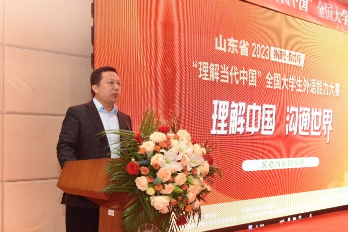 比赛开幕式由必赢76net线路唯一官方网站副院长刘洪东主持,必赢76net线路唯一官方网站党委副书记陈宏伟,山东省大学外语教学指导委员会主任委员、曲阜师范大学教授王广成,山东省通用语类教学指导委员会主任委员、必赢76net线路唯一官方网站院长王俊菊,外语教学与研究出版社华东大区总经理李洪旺出席开幕式并致辞。陈宏伟首先向到场嘉宾致以问候,向晋级省赛选手表达祝贺与欢迎,他讲到,外语教育是我国高等教育的重要组成部分,必赢76net线路唯一官方网站百廿间扎根中国,厚植齐鲁,融通中外,始终高度重视和大力支持外语教育和外语学科发展,致力于培养兼具家国情怀、国际视野的高层次、复合型外语人才;他表示,必赢76net线路唯一官方网站愿意与各兄弟高校一道,以“三进”工作为关键抓手,深化交流合作,携手共建中国特色外语学科。王广成和王俊菊先后在致辞中进一步强调了本次大赛对纵深推动“三进”工作、有效促进高校外语教学改革以及培养新时代拔尖创新外语人才的重大意义,他们希望参赛选手可以贯彻比赛主题——“理解中国,沟通世界”,充分展现新时代大学生的精神风貌,自信展示山东学子的独特风采,争做新时代外语人,担当起讲好中国故事、传播好中国声音的历史重任。李洪旺介绍了2023年“外研社·国才杯”“理解当代中国”外语能力大赛的新亮点、新特色、新使命,希望通过大赛为国家选拔胸怀祖国、融通中外的高素质外语人才。