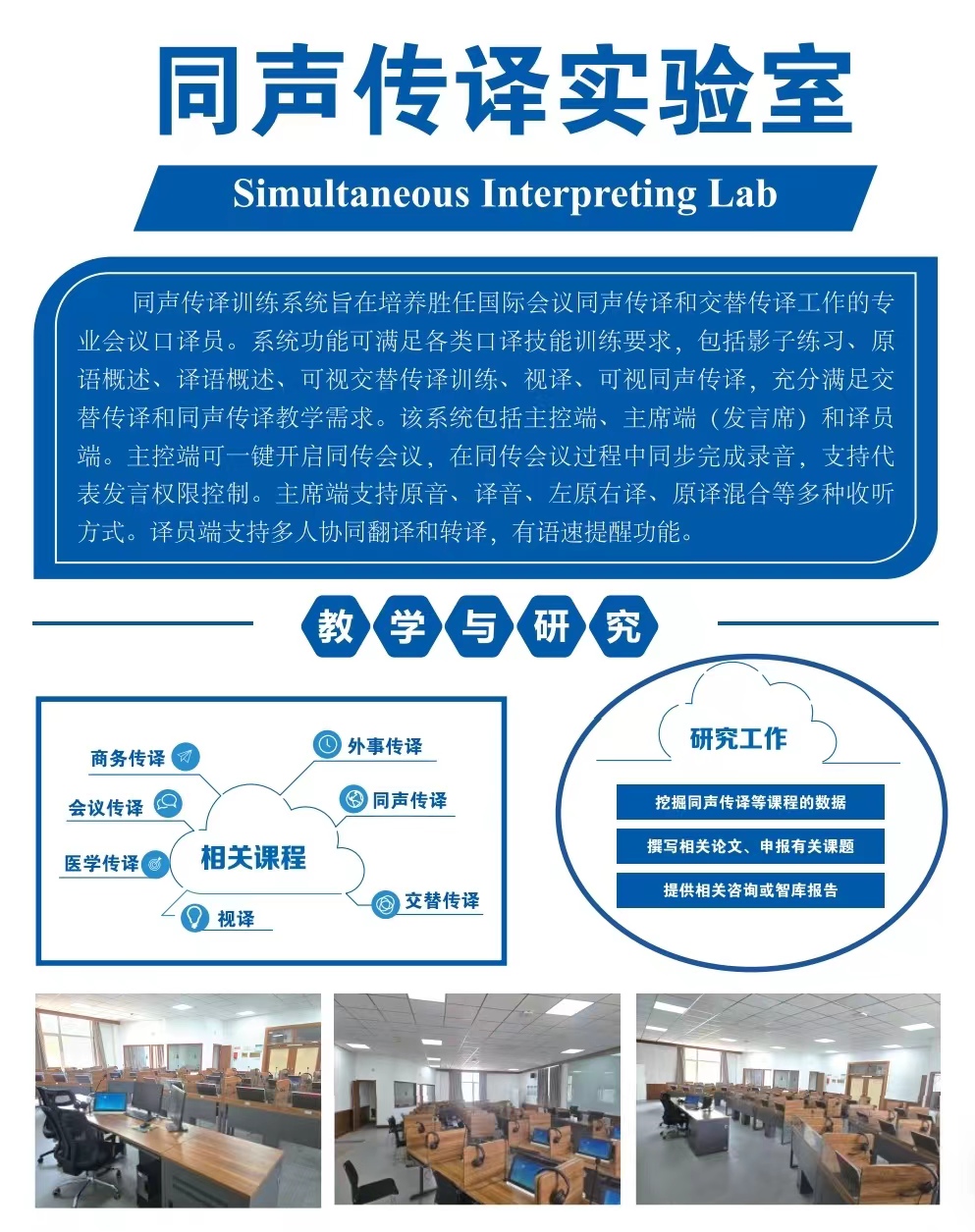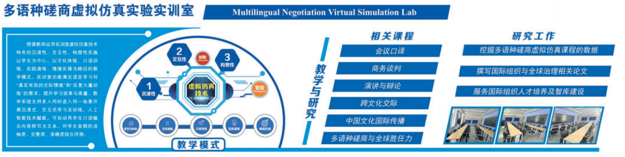 针对以上目标,多语数智新文科实验室建立了“6+1”实验室体系(6个实验室+1个基地):多语种磋商虚拟仿真实验实训室、同声传译实验室、智慧写作与翻译实验室、多语种舆情分析实验室、神经语言学与语言障碍研究实验中心、东北亚智库实验室以及语言认知康复基地。该新文科实验室兼顾人才培养及学科建设,把教学与研究有机结合起来,展现了新文科实验室服务国家战略急需以及区域社会经济发展的突出特点。