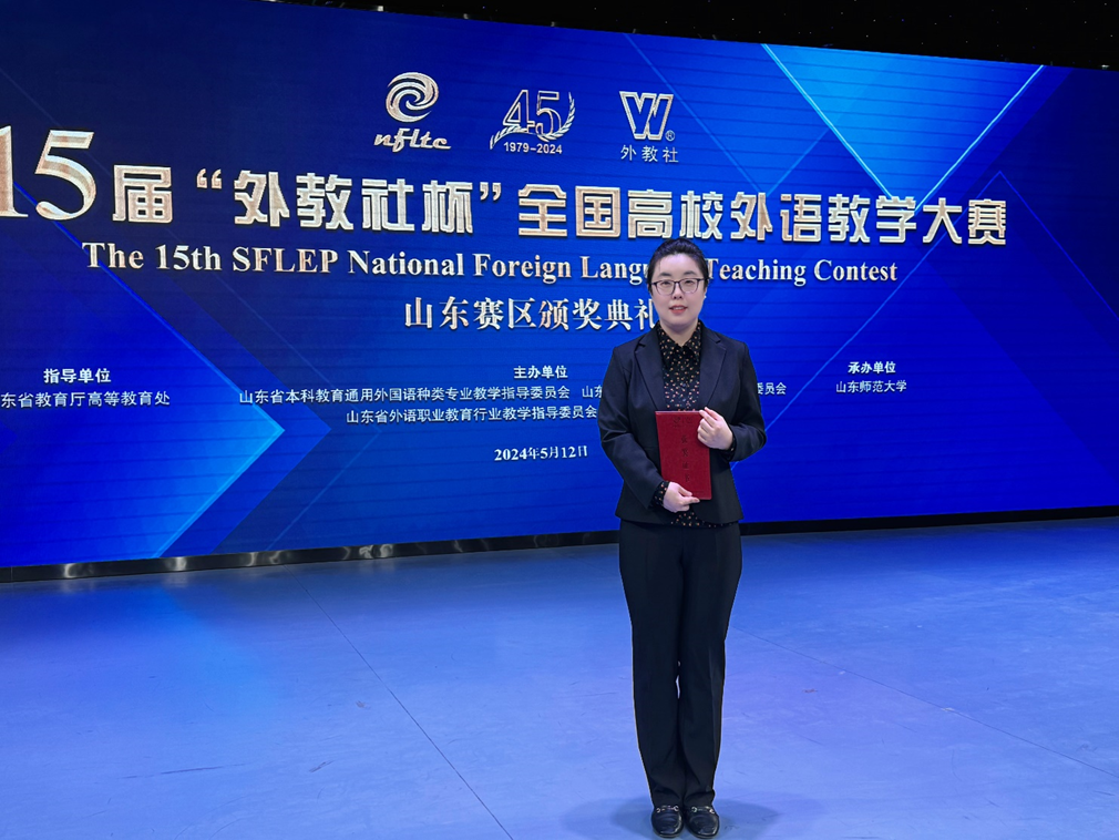 此次大赛吸引了山东省120所高校的162位主讲教师参赛,竞争激烈。在本科大学英语组54所高校的参赛教师中,林佳副教授凭借创新的教学理念、匠心独运的教学设计、流利清晰的语言表达以及灵活自如的课堂掌控力,在复赛中拔得头筹;决赛中更是以出色表现总分名列前茅,最终获得一等奖,展现了必赢76net线路唯一官方网站教师的风采。