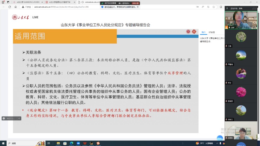 报告中,周详围绕“《事业单位工作人员处分规定》解读”的主题,立足加强高校工作人员的教育、管理和监督,对《处分规定》的原则、种类、适用、权限、程序等情况进行了全面解读。报告采用案例教学的形式,强调高校教师要严格自律,规范言行举止,不踩红线,不碰底线,依法依规依纪为学从教,高标准严要求为党育人、为国育才。